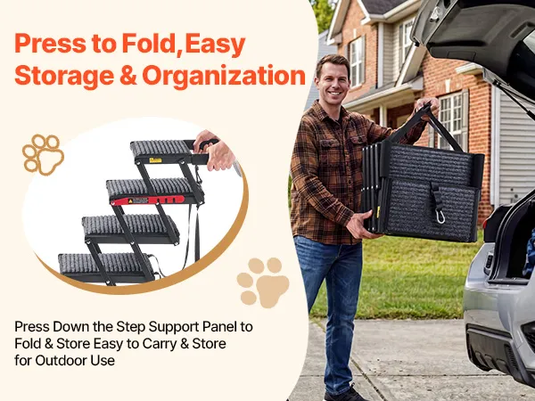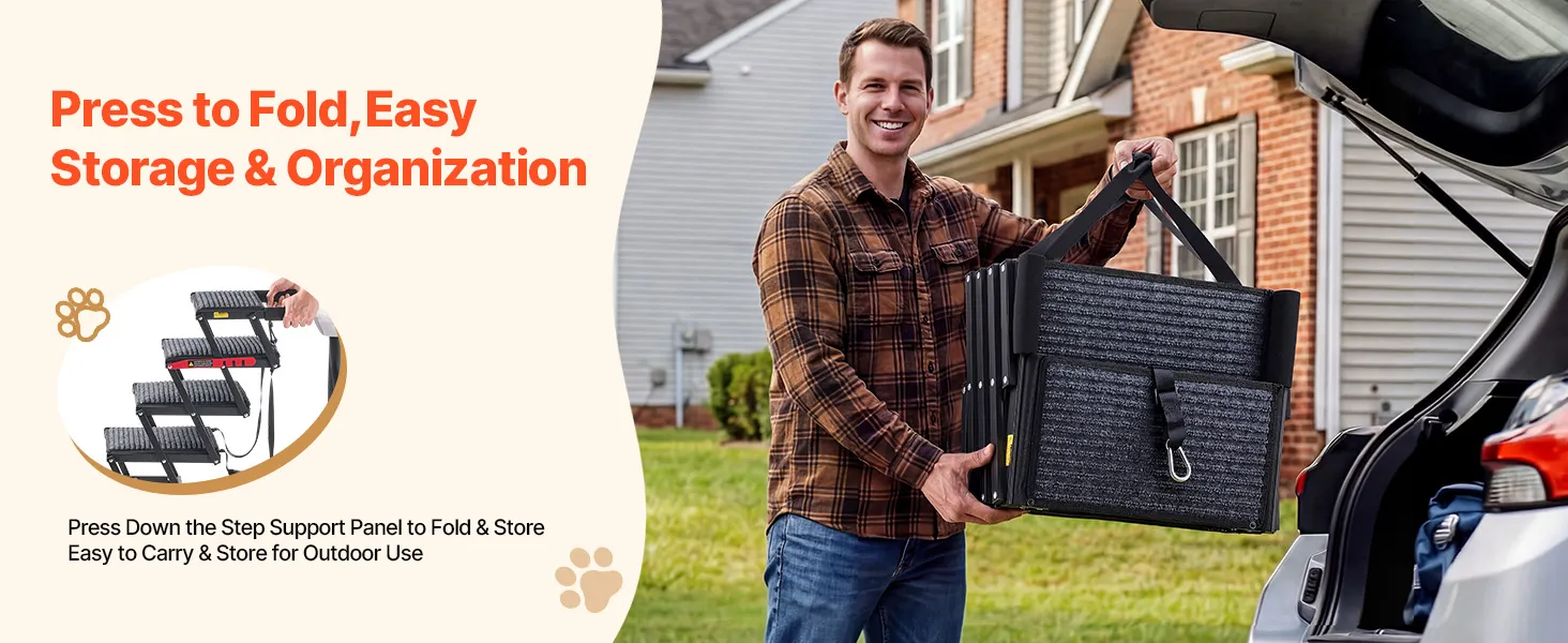 Onze opvouwbare trap voor grote honden is lichtgewicht en draagbaar voor dagelijks gebruik. Dankzij het opvouwbare ontwerp kan de trap ruimtebesparend worden opgeborgen in de auto of thuis.