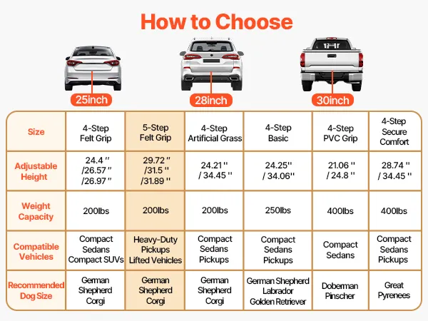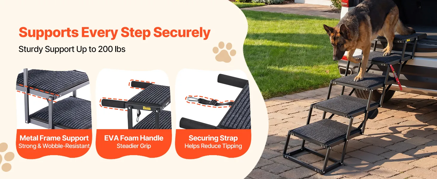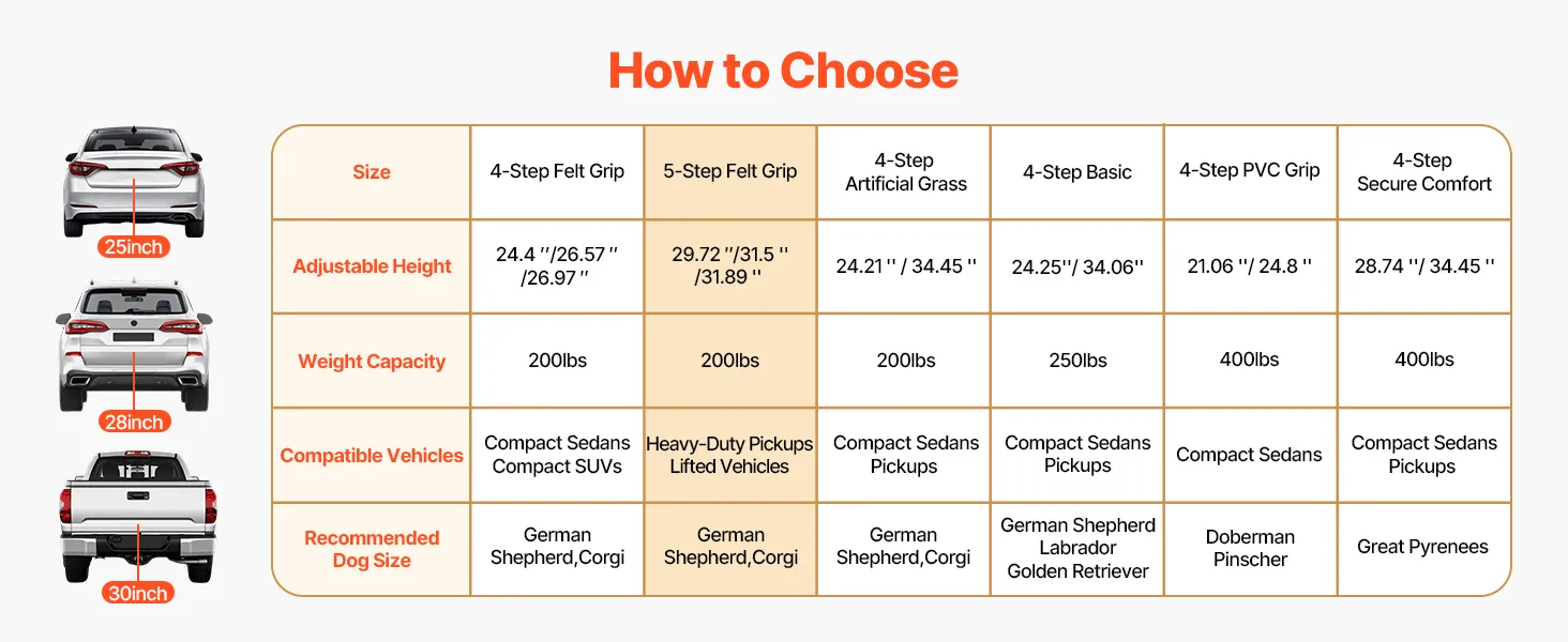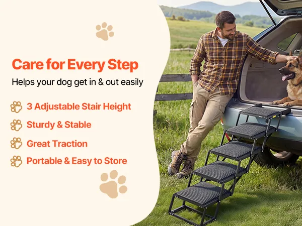 • Gemakkelijke toegang voor uw hond: Deze hondenoprijplaat heeft vijf treden en drie verstelbare hoogte-instellingen. Hij is ideaal voor oudere honden of huisdieren met beperkte mobiliteit, waardoor ze veilig in en uit de kofferbak kunnen stappen.
