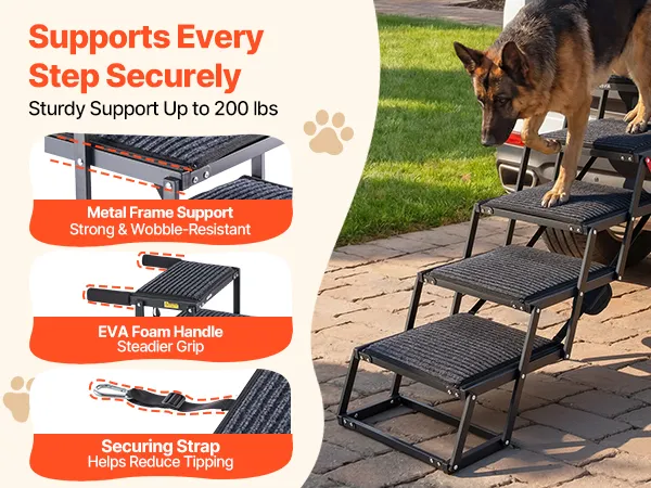 • Robuust en veilig: De hondenladder met zijn stevige metalen frame kan tot 90 kg dragen. De constructie is wiebelig en stabiel, terwijl schuimrubberen handgrepen en een veiligheidsriem zorgen voor een veilige grip tijdens het klimmen.
