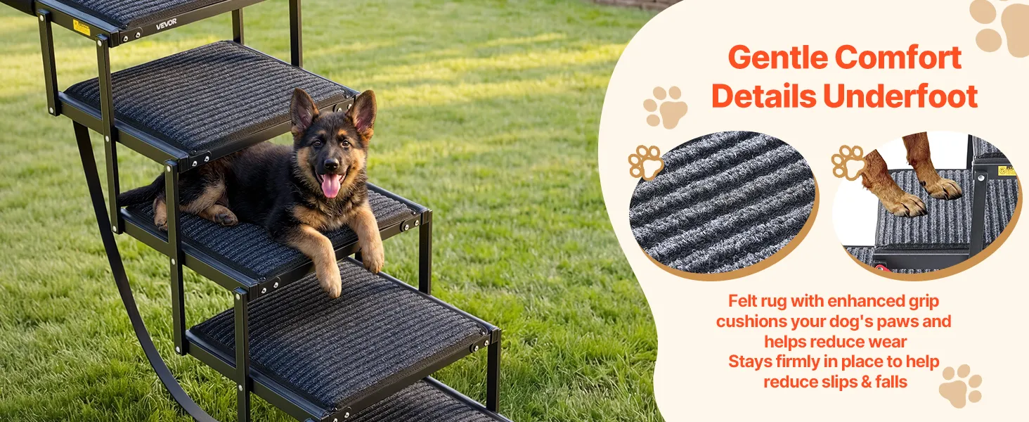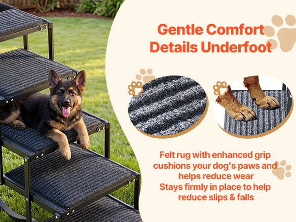 • Comfortabele toegang tot de trap: Onze hondenhelling heeft brede treden bekleed met zacht vilt om de poten van uw hond te beschermen tegen verwondingen. Het oppervlak biedt een veilige grip en voorkomt uitglijden, zodat uw hond veilig de helling op kan.
