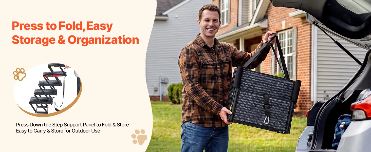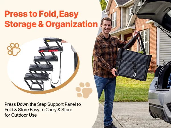 Onze opvouwbare trap voor grote honden is lichtgewicht en draagbaar voor dagelijks gebruik. Dankzij het opvouwbare ontwerp kan de trap ruimtebesparend worden opgeborgen in de auto of thuis.