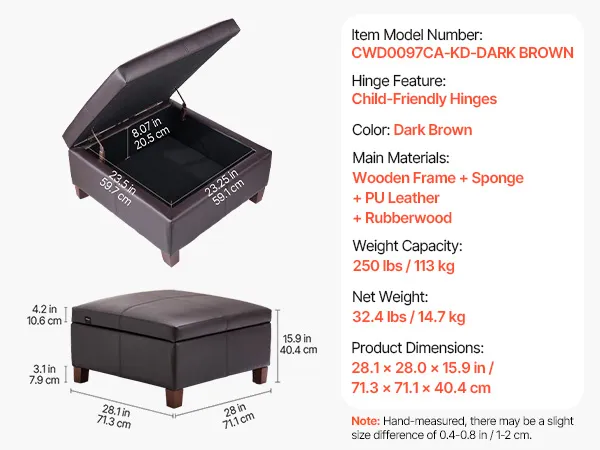 VEVOR Vierkante leren poef met opbergruimte, gestoffeerde salontafel met gecapitonneerde knopen en opklapbaar ontwerp, PU-leer met spons met hoge dichtheid voor woonkamer/slaapkamer donkerbruin
