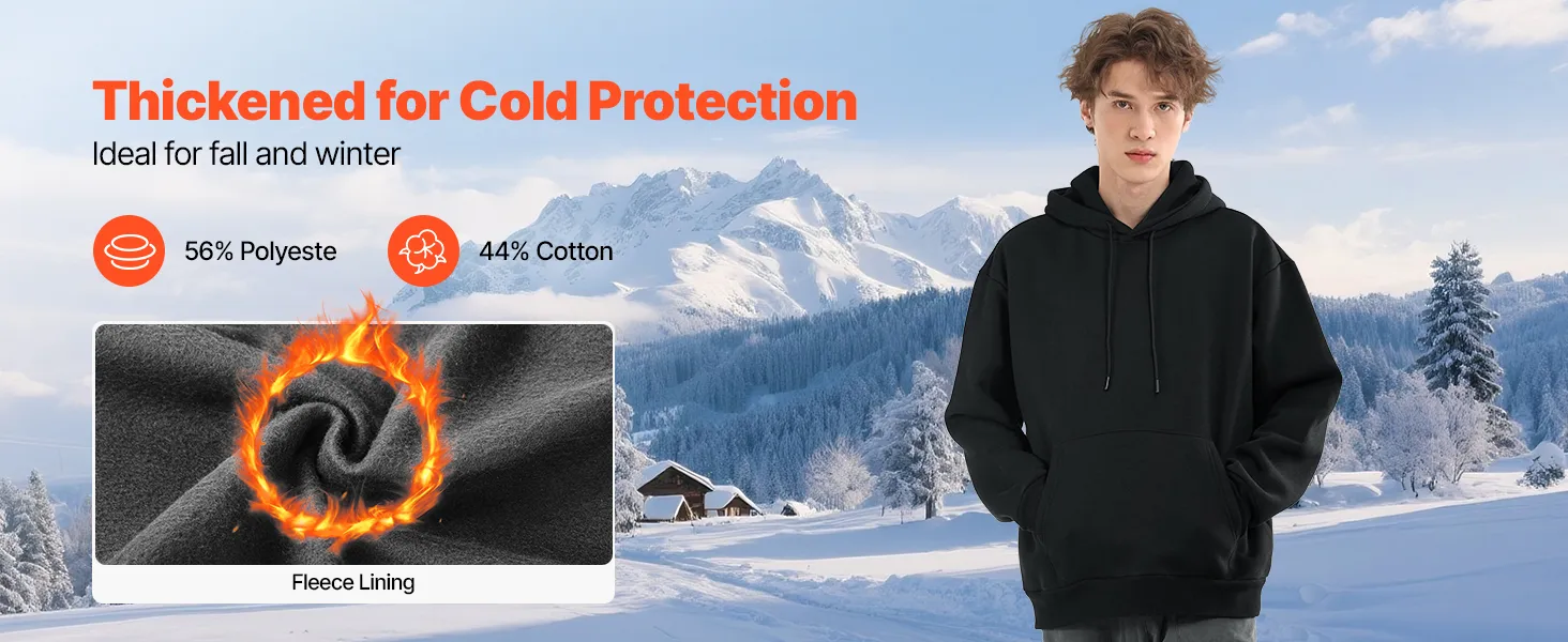 We gebruiken een mix van 56% polyester en 44% katoen. De fleecevoering van de hoodie houdt warmte vast en voelt comfortabel aan op de huid – ideaal voor koele herfst- en winterdagen.
