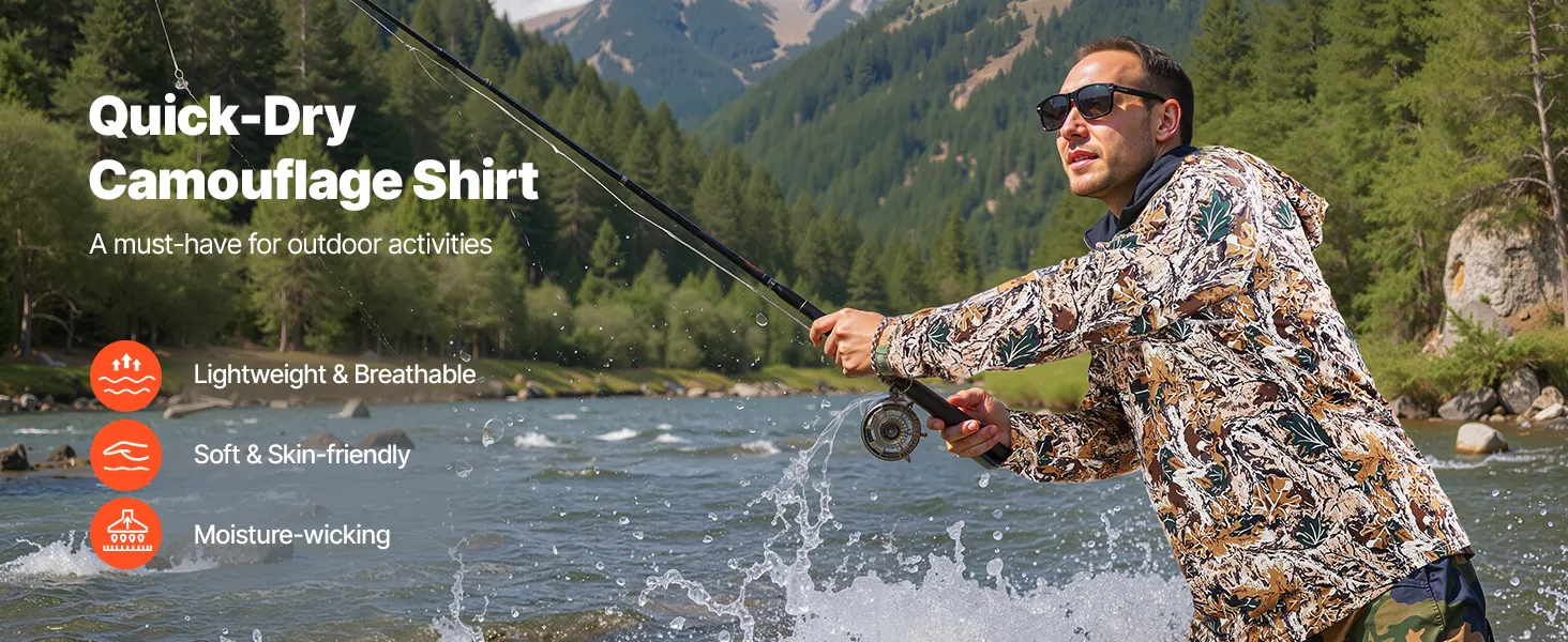 Deze sneldrogende camouflagehoodie houdt je koel, lichtgewicht en ademend. Of je nu gaat wandelen of op een missie bent, hij houdt je fris en droog tijdens elk outdooravontuur.