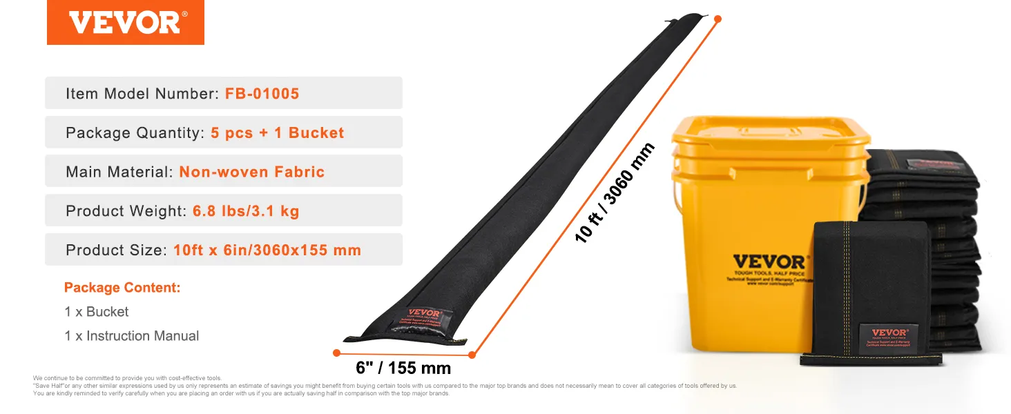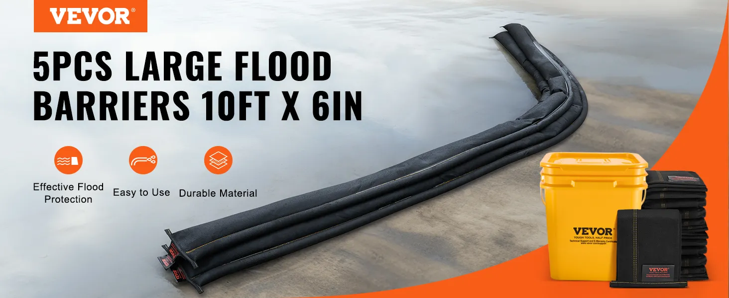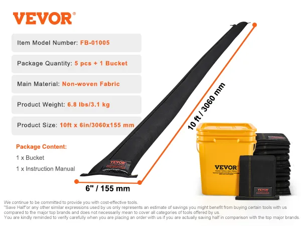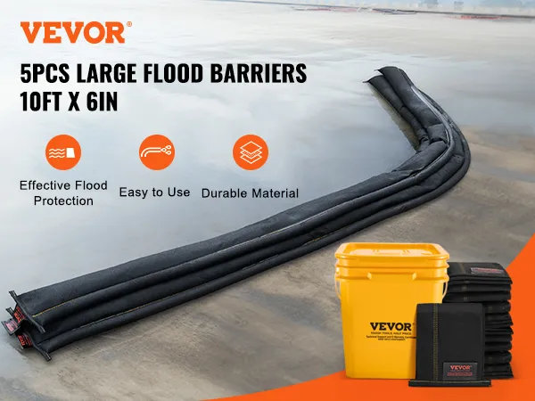 Effective Flood Protection: This kit includes 5 flood barriers, each 10ft x 6in, with 619g of absorbent gel per barrier, capable of absorbing up to 12.5kg of water. Upon contact with water, they swiftly expand to form a sturdy 3" to 4" heavy-duty barrier, effectively blocking floodwaters to protect your home, garage, and basement.