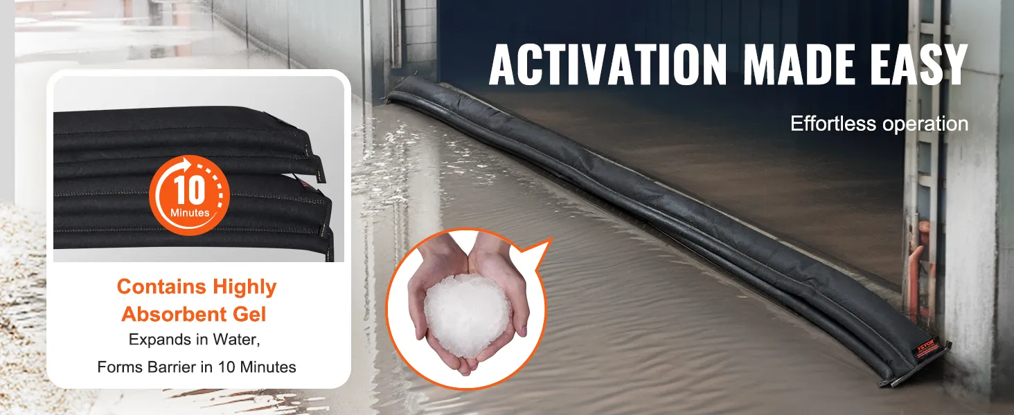 Easy to Use: These water barriers for flooding activate upon contact with water, requiring no sand or manual filling. Simply place them in flood-prone areas like driveways, garages, or doorways, and connect end to end for better protection.