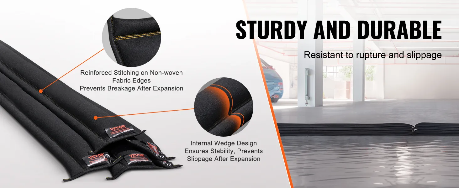 Durable Construction: Made from high-density non-woven fabric with reinforced stitching, these flood barriers for home are robust and durable. The built-in wedge design ensures stability under pressure, providing continuous protection for 3-6 months after expansion without shifting.