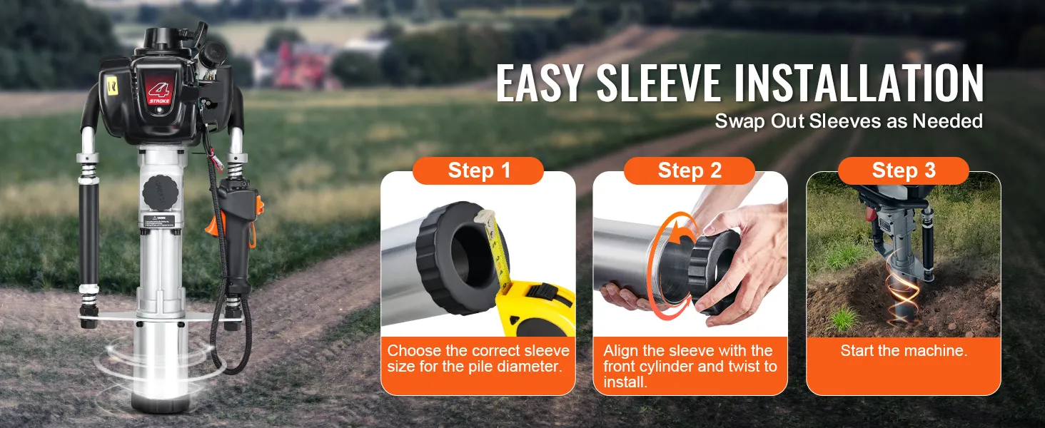 3 Various Sleeves: The pile driver comes with three different piling heads (including sleeve diameters: 45mm, 55mm, and 88mm). You can switch sleeves according to the size of the pile. The hammerhead at the sleeve part is extremely strong, making piling both easy and efficient.