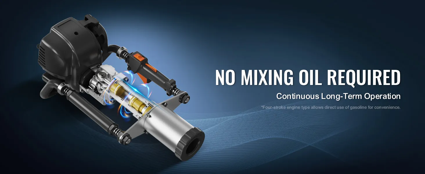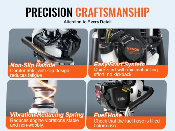 User-Friendly Design: The pile driver features a non-slip handle for comfort, an easy start device for quick ignition with minimal pulling force, a shock-absorbing spring to reduce engine vibration. Oil supply hose: Before use, ensure that the oil supply hose is fully filled with oil.