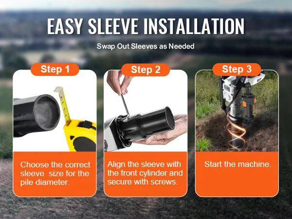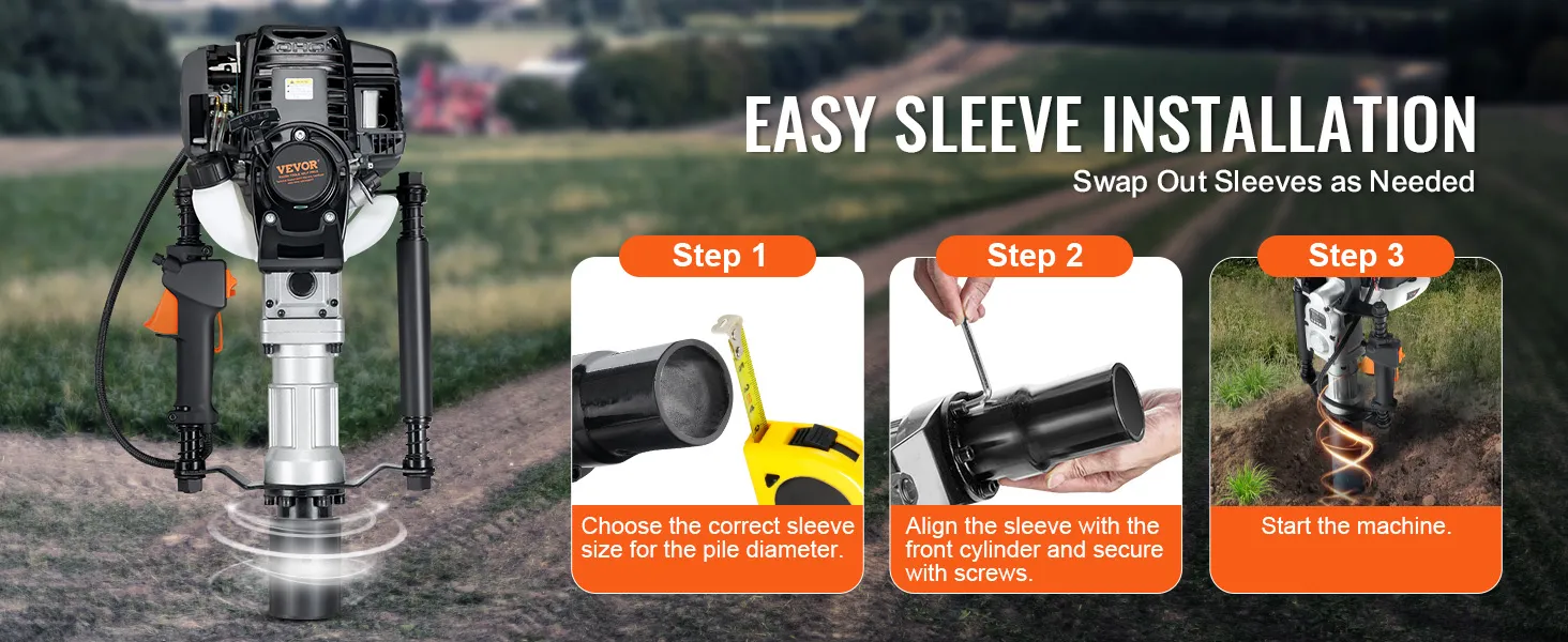 2 Various Sleeves: The pile driver comes with three different piling heads (including sleeve diameters: 55mm, and 70mm). You can switch sleeves according to the size of the pile. The hammerhead at the sleeve part is extremely strong, making piling both easy and efficient.
