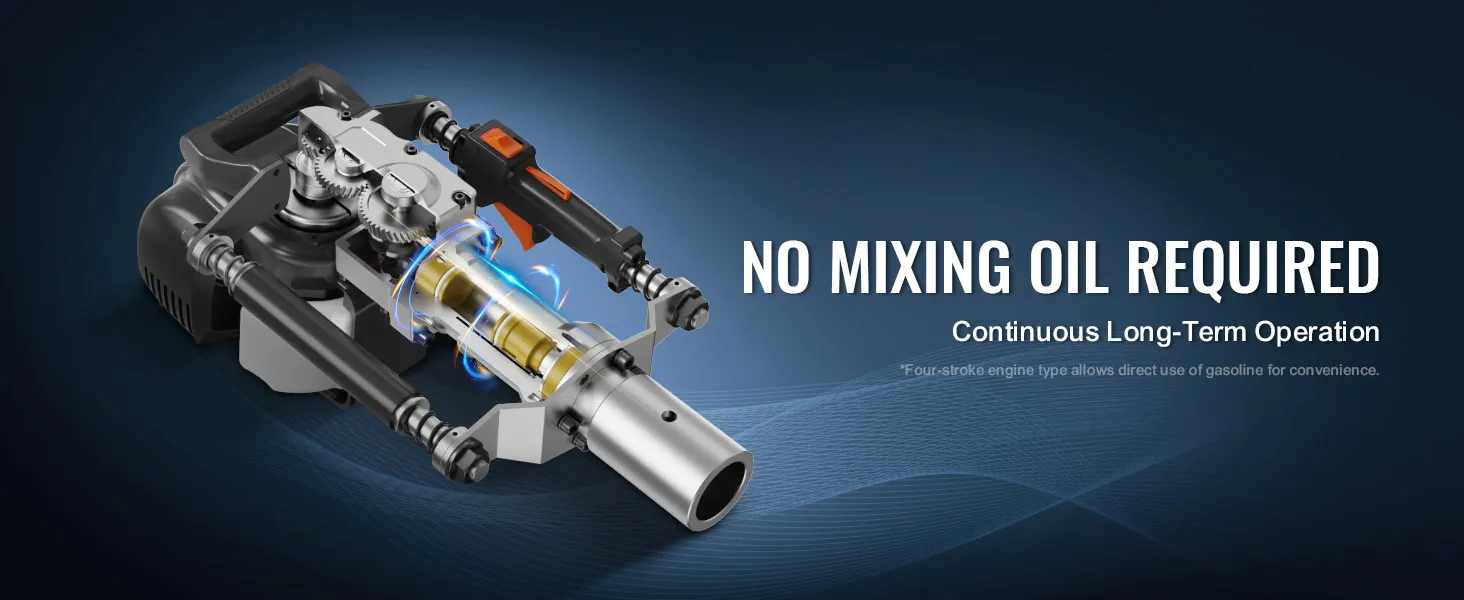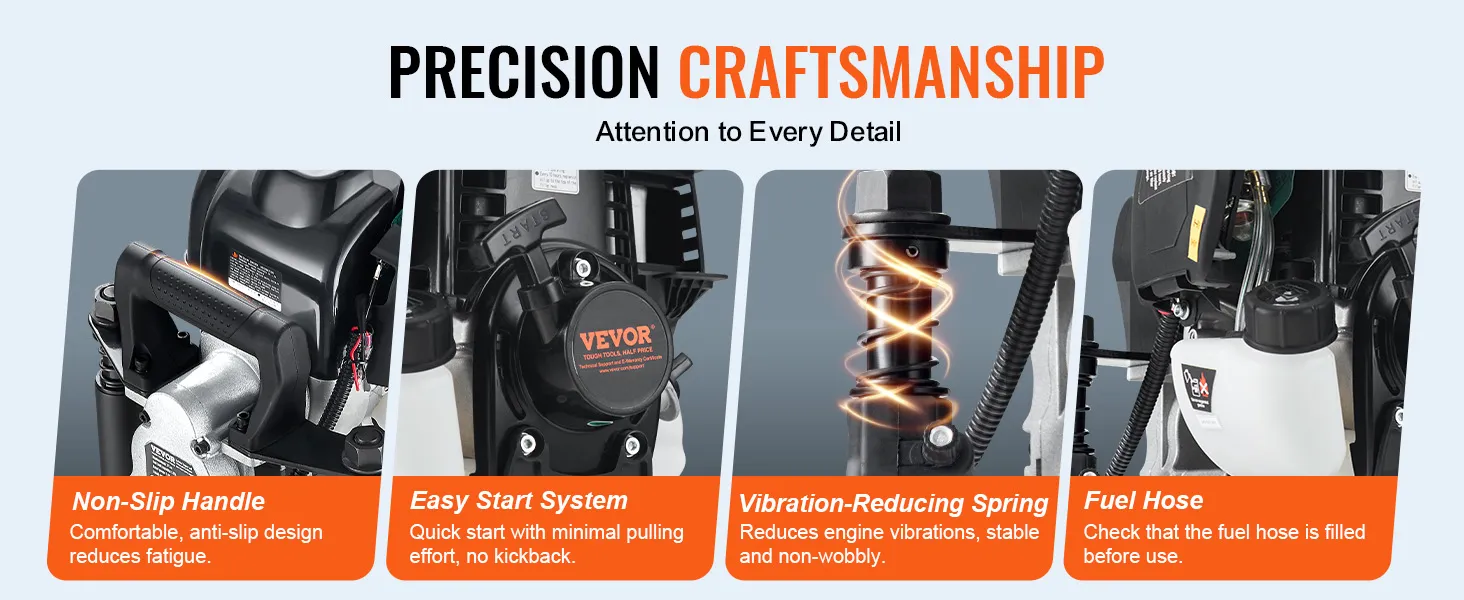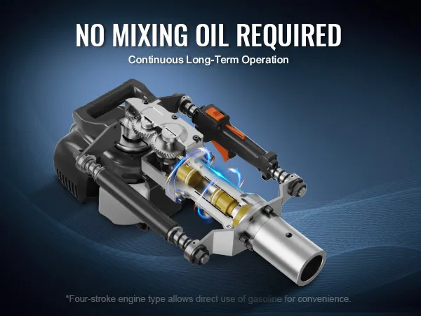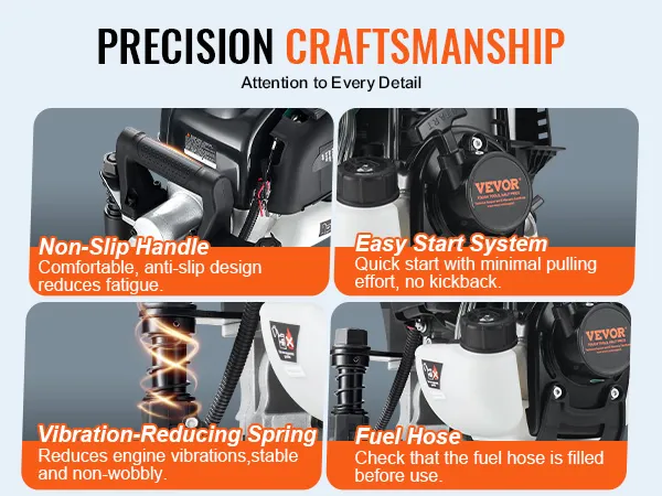 User-Friendly Design: The pile driver features a non-slip handle for comfort, an easy start device for quick ignition with minimal pulling force, a shock-absorbing spring to reduce engine vibration. Oil supply hose: Before use, ensure that the oil supply hose is fully filled with oil.
