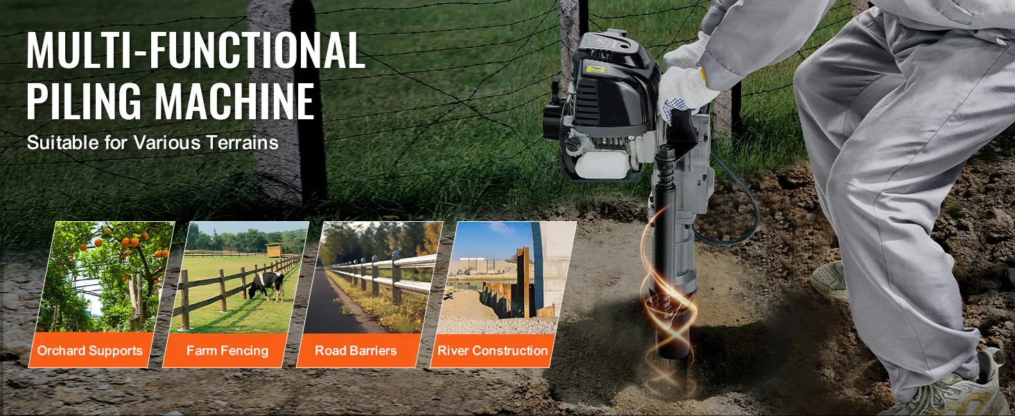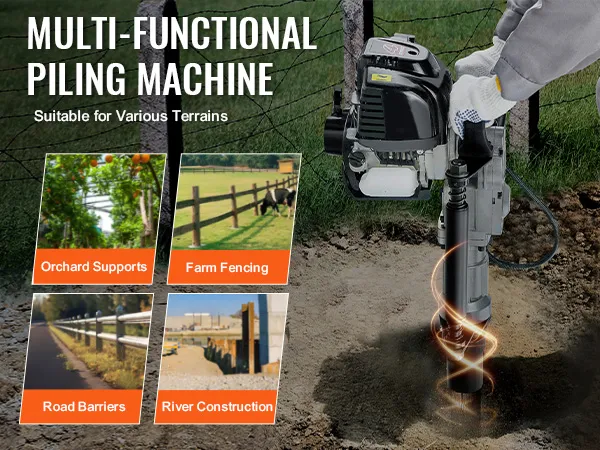 Wide Application: This pile driver is highly versatile and can be used for a broad range of applications, including installing supports in orchards, constructing farm fencing, renovating roads, and carrying out riverbank construction. It is also ideal for setting up fence posts, wooden stakes, steel columns, and other structures. Its adaptability makes it a valuable tool for various piling tasks across different industries.