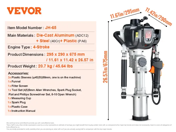 4-Stroke Engine: The engine and body are made from durable aluminum alloy. With a powerful 1000W output, it ensures fast, stable, and precise piling. Rated speed: 6500 RPM. The engine operates smoothly, doesn’t overheat, and utilizes fuel efficiently. Maximum torque: 1.6 N·m.