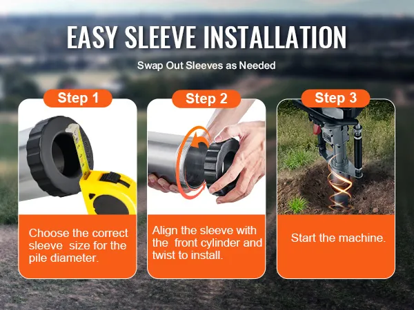 3 Various Sleeves: The pile driver comes with three different piling heads (including sleeve diameters: 45mm, 55mm, and 88mm). You can switch sleeves according to the size of the pile. The hammerhead at the sleeve part is extremely strong, making piling both easy and efficient.