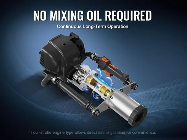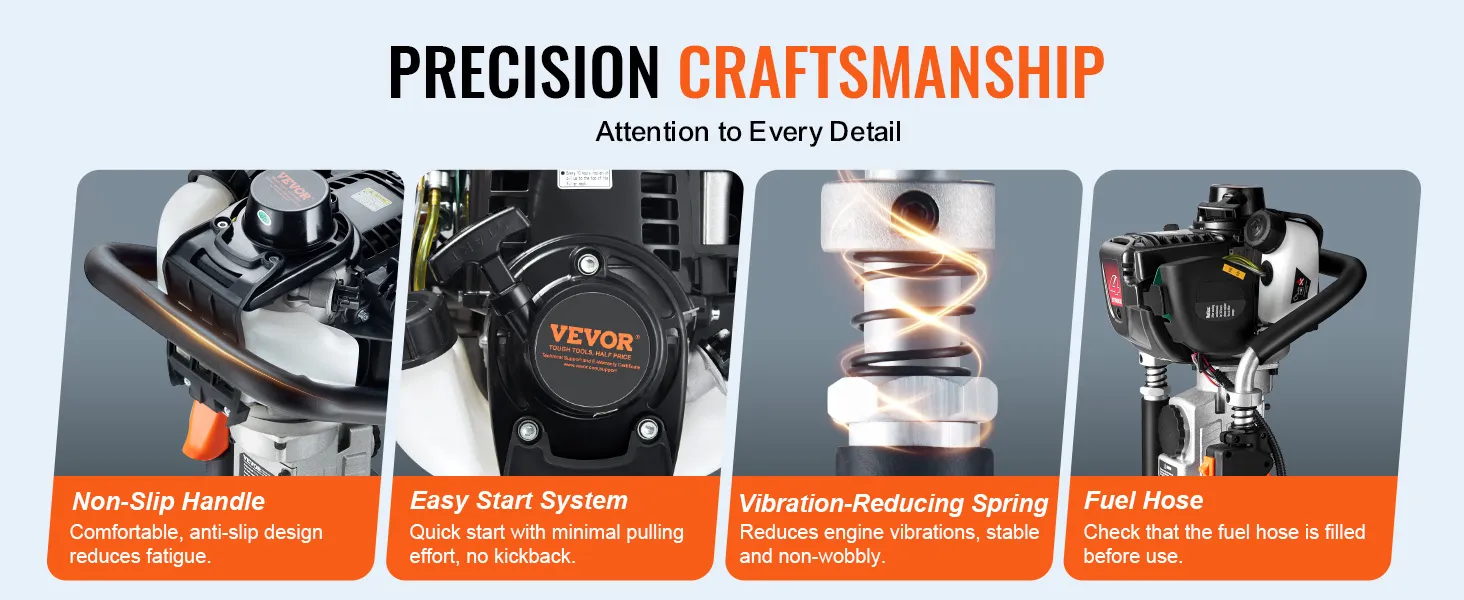 User-Friendly Design: The pile driver features a non-slip handle for comfort, an easy start device for quick ignition with minimal pulling force, a shock-absorbing spring to reduce engine vibration. Oil supply hose: Before use, ensure that the oil supply hose is fully filled with oil.