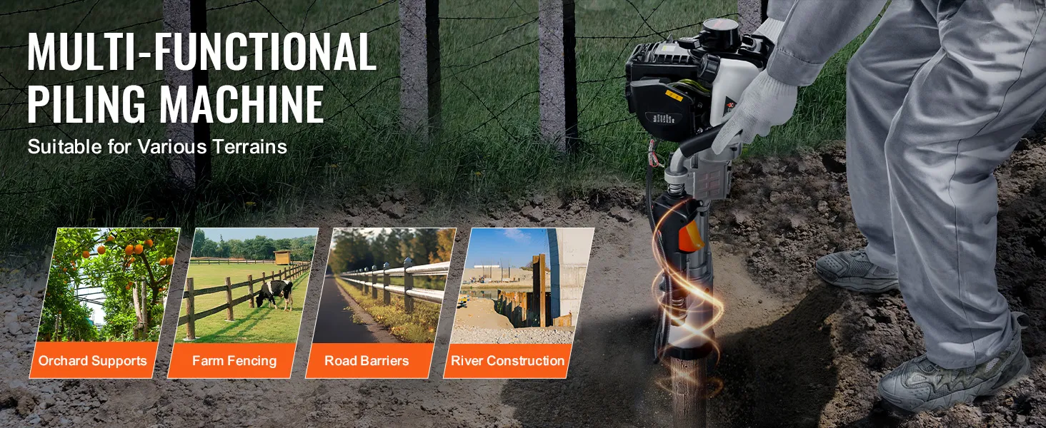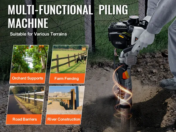 Rapid Piling: This 37.7cc pile driver features a fast piling speed, strong hammering force, and an impact frequency of up to 1500–2000 BPM with an impact energy of 35J. It enhances work efficiency, allowing you to complete piling tasks quickly. For effective piling, avoid sandy, rocky soils and areas with tree roots, as these obstacles may prevent proper installation