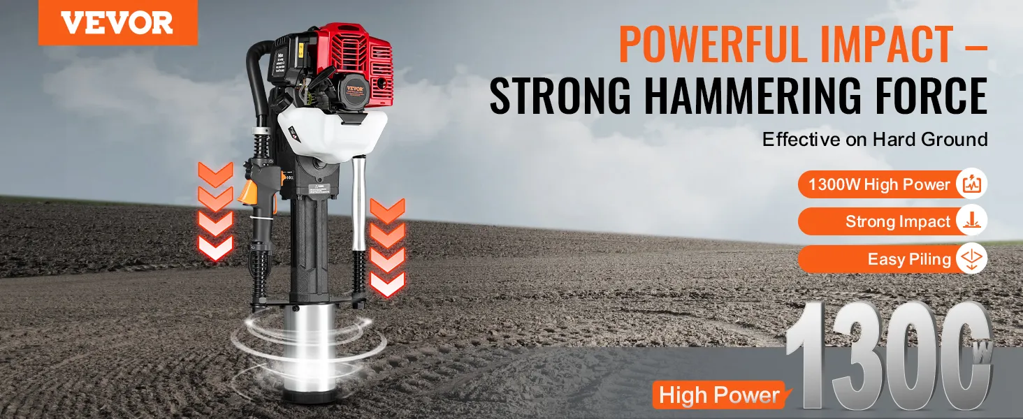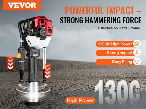 Snel heien: deze 52cc-heihamer biedt een hoge heisnelheid, een sterk slagvermogen en een slagfrequentie tot 1300-1700 BPM met een slagenergie van 50 J. Het verhoogt de werkefficiëntie en stelt u in staat het heiwerk snel te voltooien.