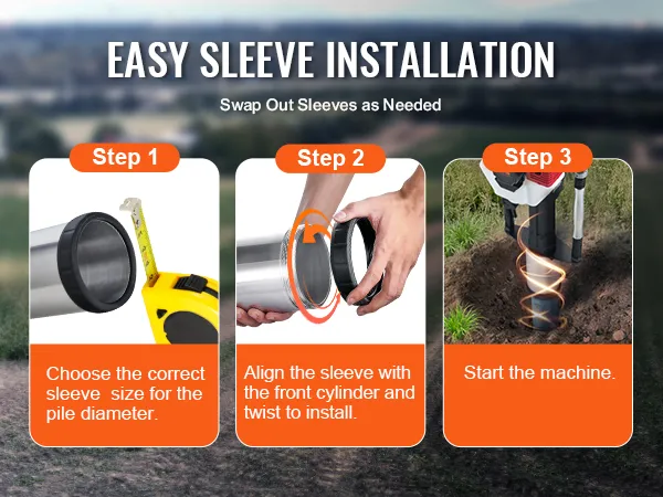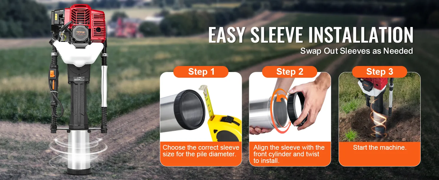 Deze heimachine is voorzien van heihulzen in verschillende maten. Je kunt de mouwen aanpassen aan de grootte van de stapels. De sterkte van de hamerkop in het hulsdeel is zeer hoog, waardoor je gemakkelijk en snel palen kunt inslaan.