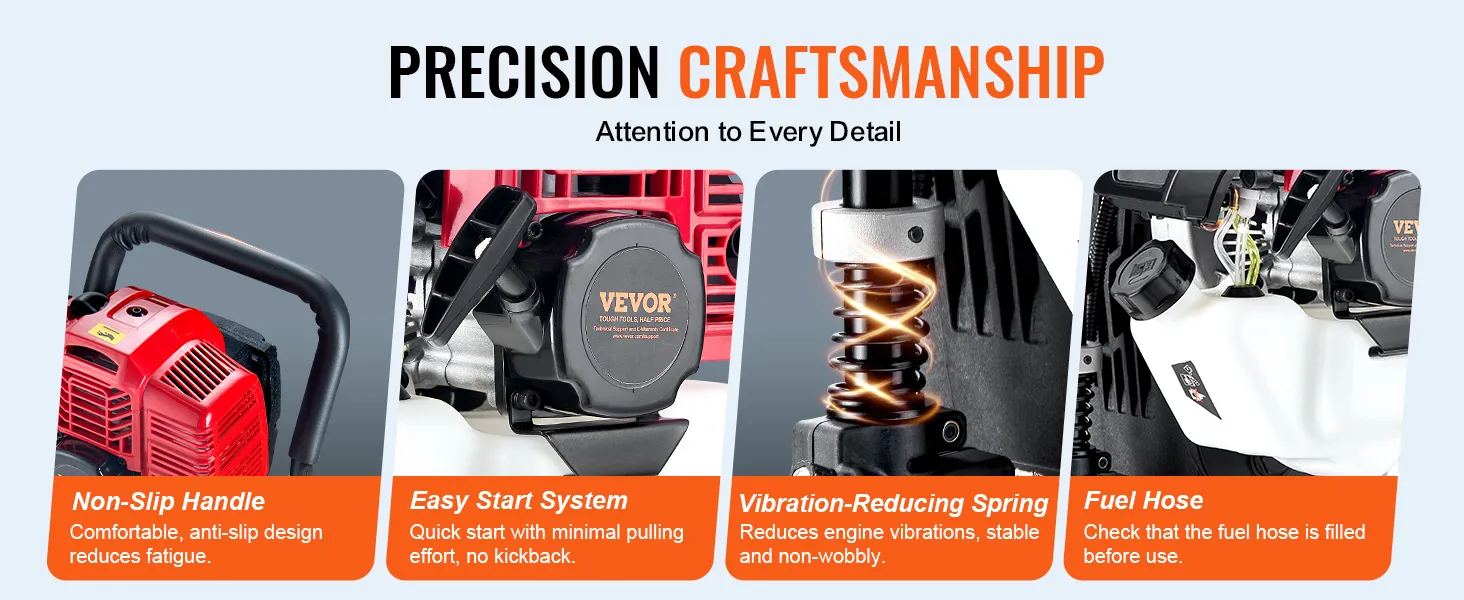 2-taktmotor: De motor en behuizing zijn gemaakt van een duurzame aluminiumlegering. Met een krachtig vermogen van 1400 W zorgt hij voor snel, stabiel en nauwkeurig rammen. Nominaal toerental: 7500 tpm. De motor loopt soepel, raakt niet oververhit en gebruikt brandstof efficiënt.