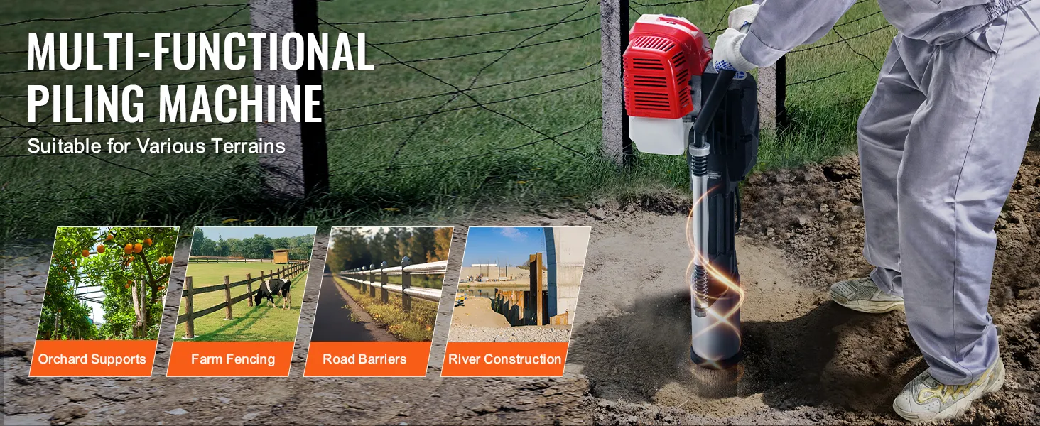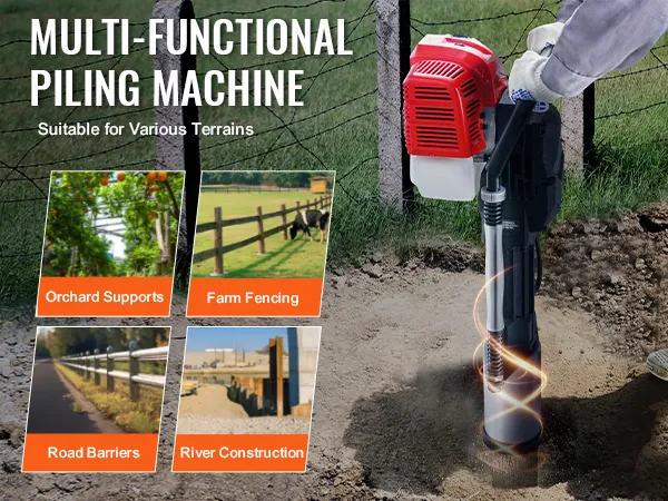 Brede toepassing: deze heimachine is uiterst veelzijdig en kan voor een breed scala aan toepassingen worden gebruikt, waaronder het installeren van steunen in boomgaarden, het bouwen van landbouwhekken, het renoveren van wegen en het uitvoeren van bouwwerkzaamheden aan rivieroevers. Het is ook ideaal voor het plaatsen van hekpalen, houten palen, stalen steunen en andere constructies. Het aanpassingsvermogen maakt het een waardevol hulpmiddel voor diverse heiwerkzaamheden in diverse industrieën.