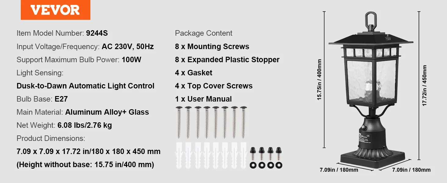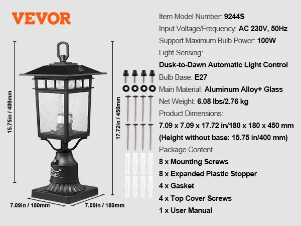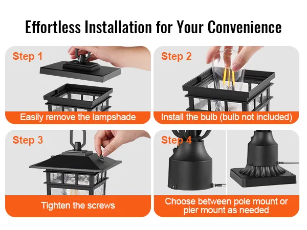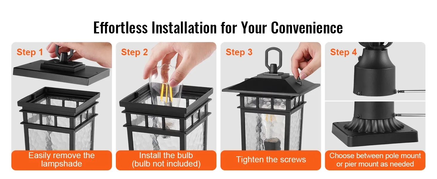 Onze buitenzuillamp is eenvoudig te installeren en wordt compleet geleverd met montageschroeven, uitbreidbare plastic plug en kolommontagebasis. Met de meegeleverde gedetailleerde installatie-instructies is het installeren van uw lamp praktisch en probleemloos.