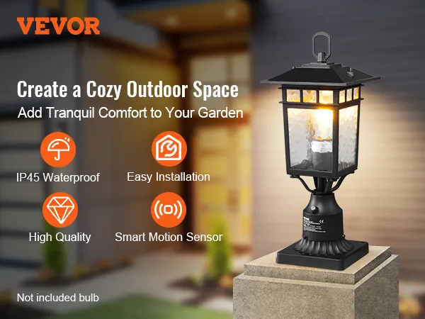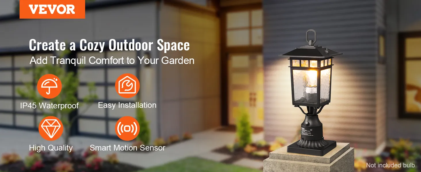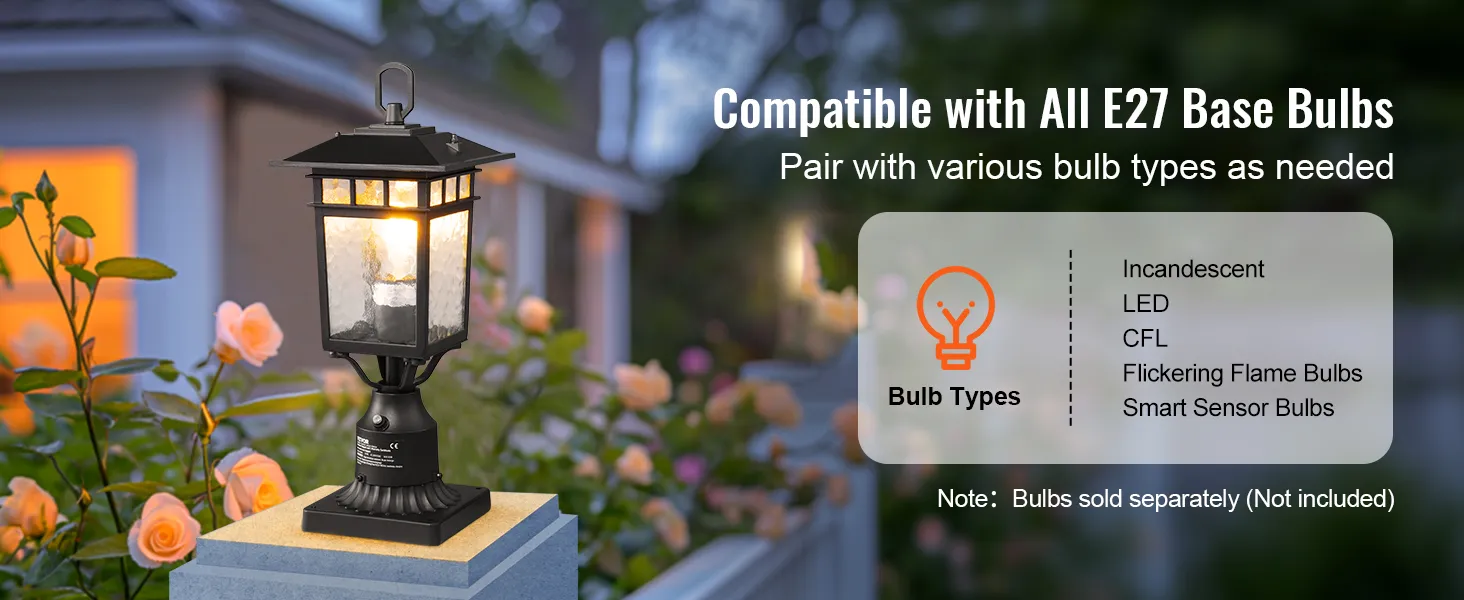 Compatibel met E27-basislampen: Verlicht uw nachten met onze buitenzuillamp die compatibel is met elke E27-basislamp - LED, gloeilamp, CFL, flikkerende vlamlamp en slimme sensorlamp, wat u maar wilt! Geniet van een consistente, betrouwbare helderheid en de vrijheid om de lamp te kiezen die bij uw stijl en behoeften past. (Lampen worden apart verkocht, niet inbegrepen)