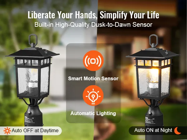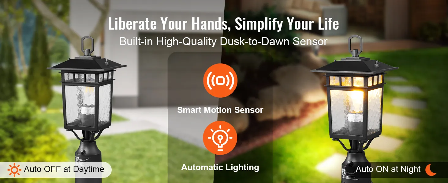 Ontdek onze buitenpaallamp, die is voorzien van een hoogwaardige schemersensor. Het detecteert op intelligente wijze de helderheid in de omgeving en schakelt 's nachts automatisch in en overdag uit.