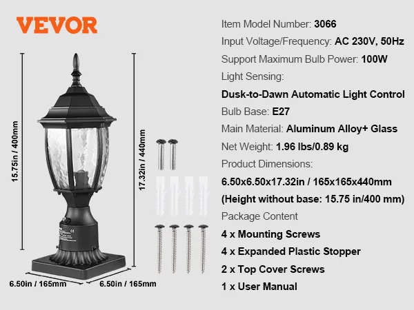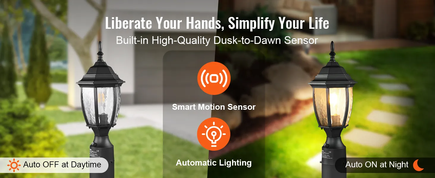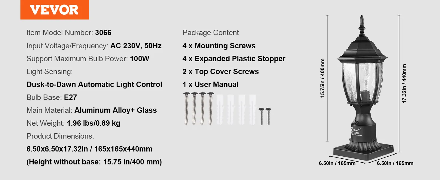 VEVOR Outdoor Schemer-tot-Dageraad lantaarnpaallamp, 400 mm hoog, waterdichte lantaarnpaallamp met 3,5 inch glazen kap op de paalbevestiging, bliksembestendige buitenpaallantaarn voor op terras en tuinpad