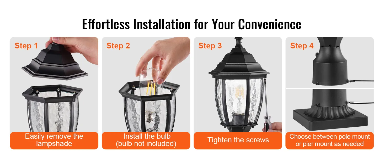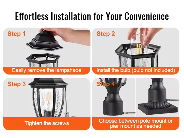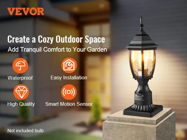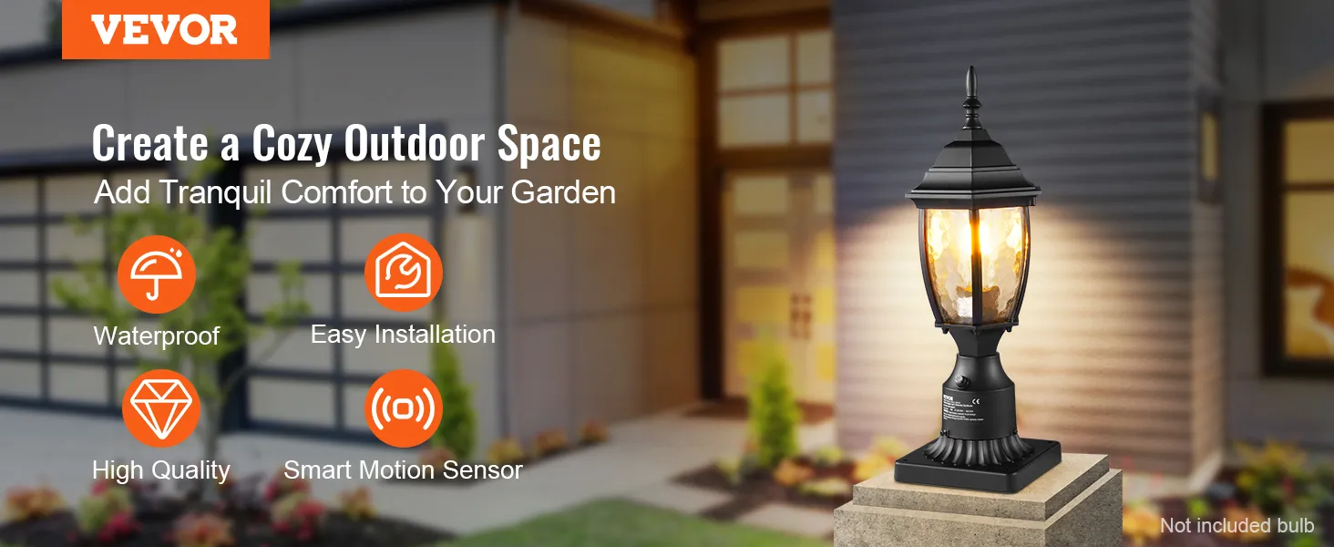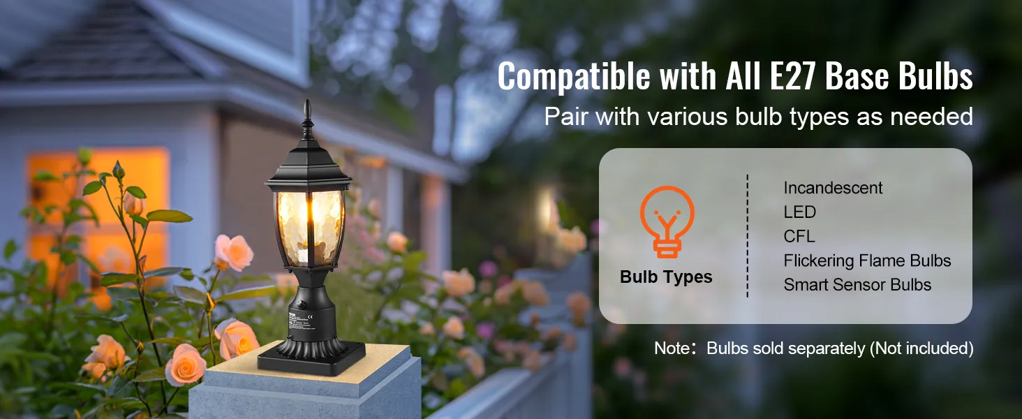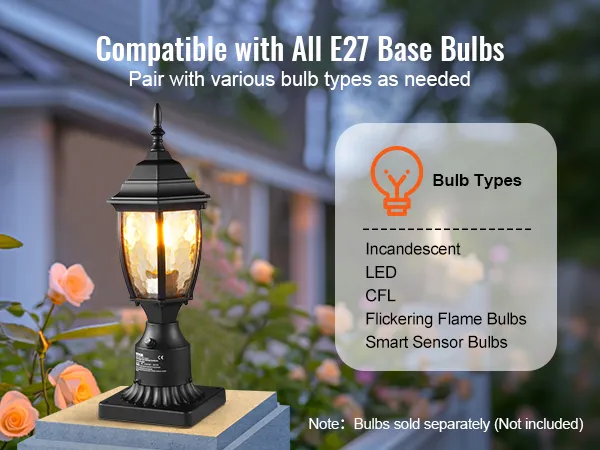 Compatibel met E27-basislampen: Verlicht uw nachten met onze buitenzuillamp die compatibel is met elke E27-basislamp - LED, gloeilamp, CFL, flikkerende vlamlamp en slimme sensorlamp, wat u maar wilt! Geniet van een consistente, betrouwbare helderheid en de vrijheid om de lamp te kiezen die bij uw stijl en behoeften past. (Lampen worden apart verkocht, niet inbegrepen)