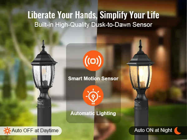 Ontdek onze buitenpaallamp, die is voorzien van een hoogwaardige schemersensor. Het detecteert op intelligente wijze de helderheid in de omgeving en schakelt 's nachts automatisch in en overdag uit.
