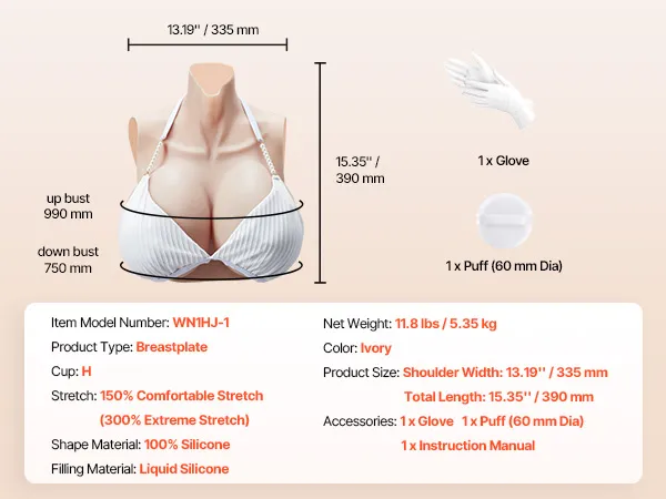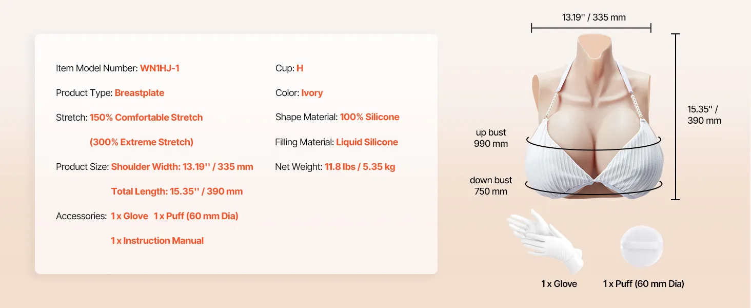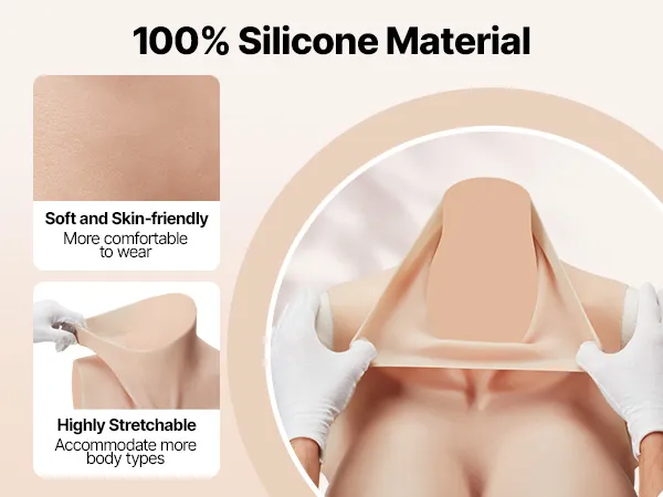Soft and Skin-Friendly: Our H-Cup silicone breastplate is made from 100% silicone, offering a soft touch and comfortable wear. It provides excellent stretching capacity, capable of extending 150%-300% of its original size. (Suitable Height: 67 - 71 inch / 170 - 180 cm ; Suitable Weight: 143 - 176 lbs / 65 - 80 kg)