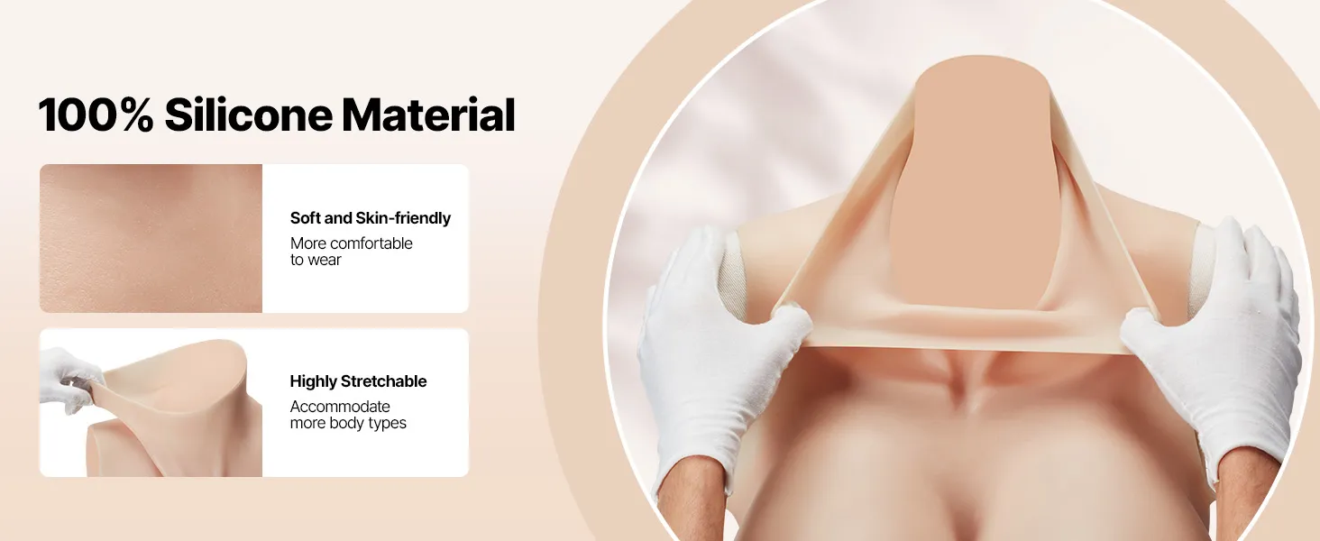 This 100% silicone breastplate is soft and skin-friendly, providing an unparalleled wearing experience. Its excellent stretchability allows the breastplate to accommodate a variety of body types, offering a more comfortable fit and showcasing a natural, realistic appearance.