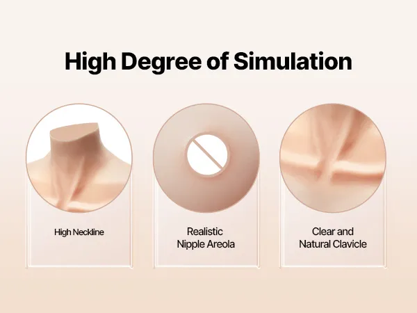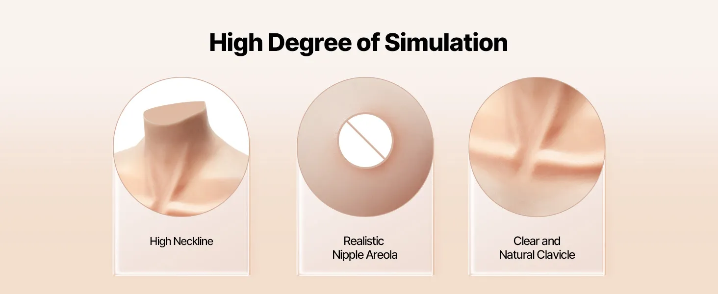 Realistic and Natural: High degree of simulation design, with high neckline, provides a realistic appearance. The obvious clavicular line and realistic nipple areola restore every detail, resulting in a more natural appearance.