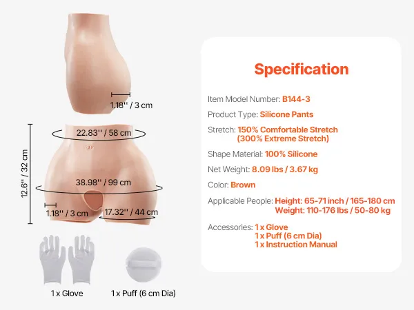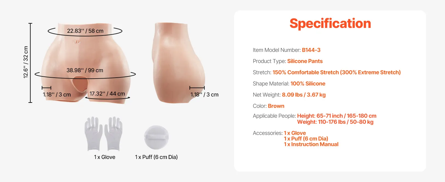 Soft and Skin-Friendly: Made from 100% silicone, our silicone butt offers a soft touch and comfortable wear. It provides excellent stretching capacity, capable of extending 150%-300% of its original size. (Suitable Waist: 27.6 - 39.4 in / 70 - 100 cm ; Suitable Height: 65 - 70.9 in / 165 - 180 cm ; Suitable Weight: 110 - 176 lbs / 50 - 80 kg)