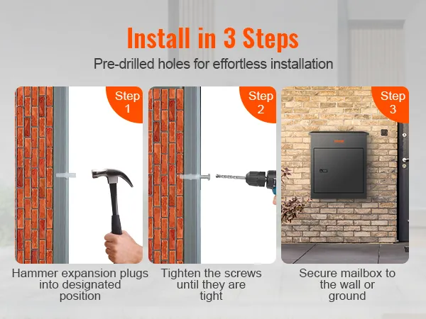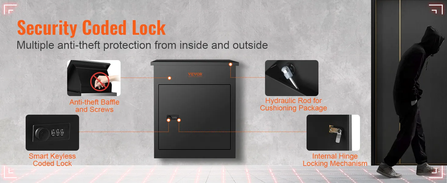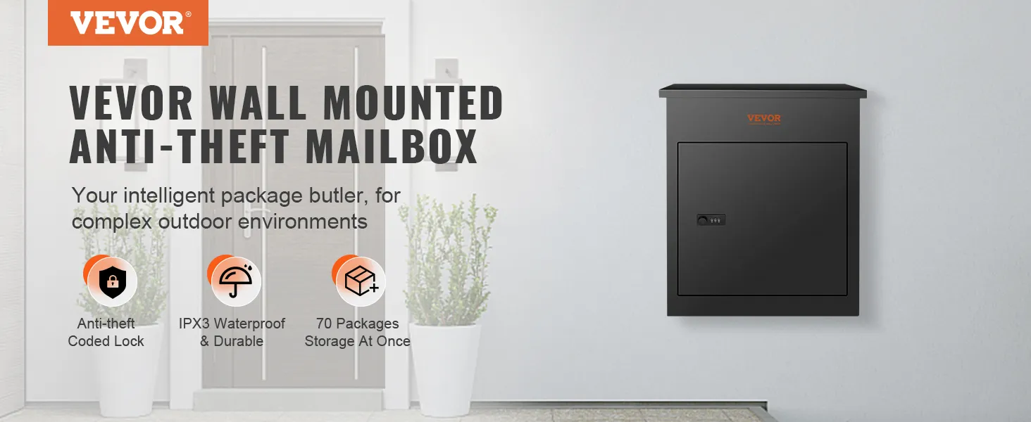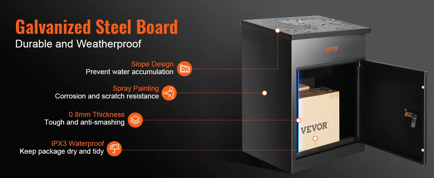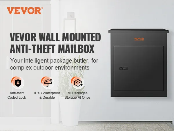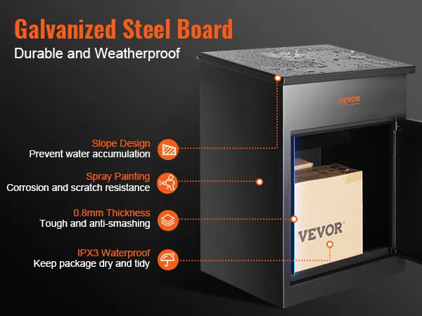 Gebruik de VEVOR anti-diefstal brievenbus - professioneel vervaardigd uit 0,8 mm dik gegalvaniseerd staal en afgewerkt met een corrosiebestendige coating. De IPX3 waterdichte strips en het afgeschuinde ontwerp houden uw pakketten droog en schoon.