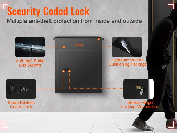 Meerdere antidiefstalbeveiligingen: maak je nooit zorgen over het verliezen van sleutels en het niet kunnen ophalen van je pakketten. Met afmetingen van 44 x 35 x 58,3 cm zijn de VEVOR buitenbrievenbussen voorzien van een veilig wachtwoordslot en een intern scharnier om ervoor te zorgen dat uw pakketten goed beschermd zijn. De opening is ook uitgerust met een groot antidiefstalapparaat, versterkte schroeven en hydraulische steunstangen om diefstal te voorkomen en schokken op te vangen.