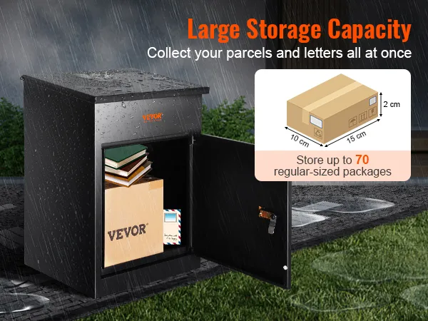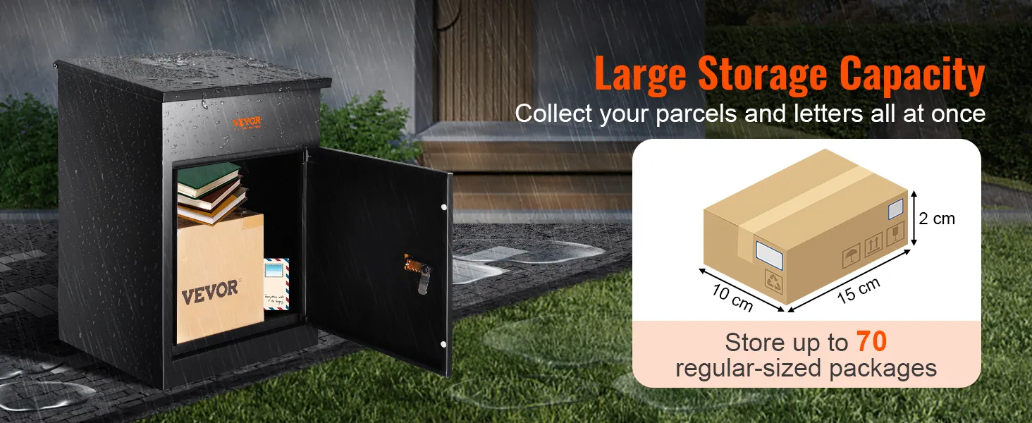 De robuuste VEVOR outdoor pakketdozen van 44 x 35 x 58,3 cm, speciaal ontworpen voor buiten, zijn de ultieme oplossing voor pakketbeheer en bieden het hele jaar door bescherming voor uw belangrijke post en pakketten.