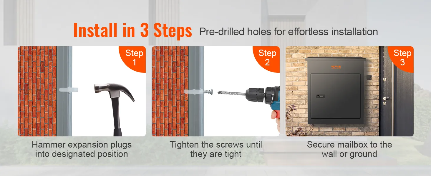 EENVOUDIGE INSTALLATIE IN 3 STAPPEN: Met een set schroeven en 4 voorgeboorde gaten in het achterpaneel kun je de pakketbus in slechts 3 stappen op muren, veranda's of stoepranden installeren. Bewaar uw pakketten handig en heb er altijd en overal toegang toe!
