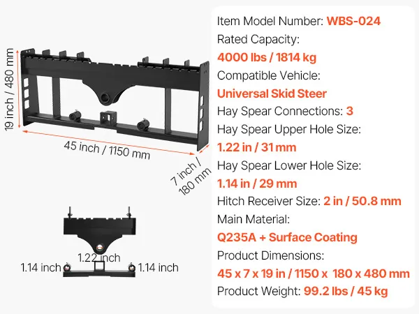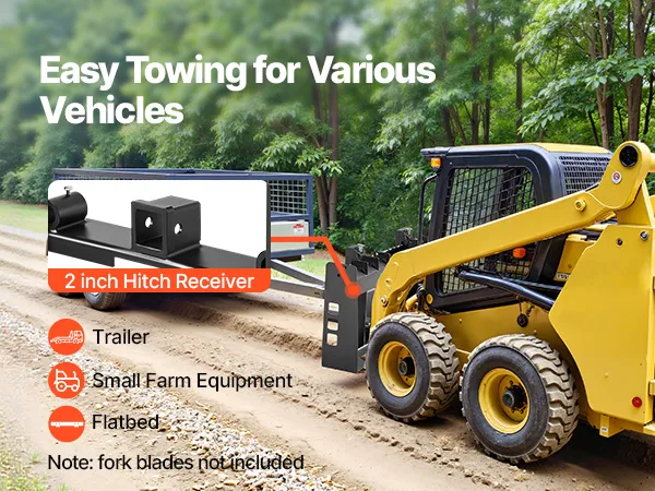 Trekking gemakkelijk gemaakt: Uitgerust met een trekhaak van 50,8 mm kan dit palletvorkframe voor schrankladers eenvoudig worden bevestigd aan trekhaken van 50,8 mm. Hierdoor kan uw schranklader of tractor aanhangwagens, diepladers of klein materieel trekken. (Aanhangwagenhaak apart verkrijgbaar)