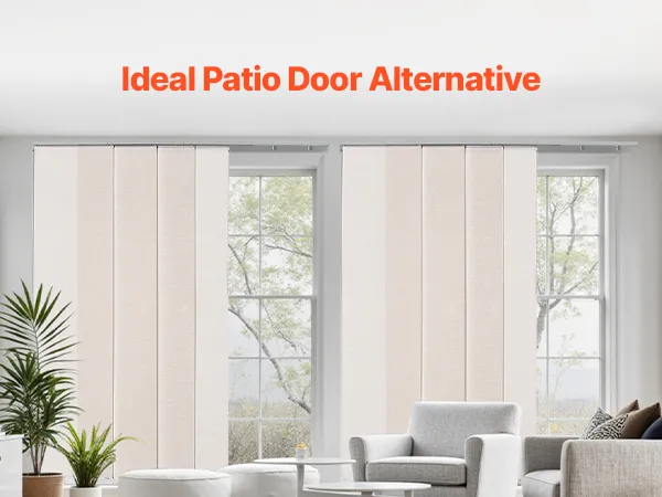Multifunctioneel ontwerp: Schuifdeurjaloezieën zijn ideaal voor terrasdeuren, balkondeuren, openslaande deuren, kastdeuren, grote ramen en kamerverdelers. Ze zijn een stijlvolle verbetering ten opzichte van traditionele verticale jaloezieën of gordijnen en hebben een volant aan de bovenkant voor een verfijnde look.