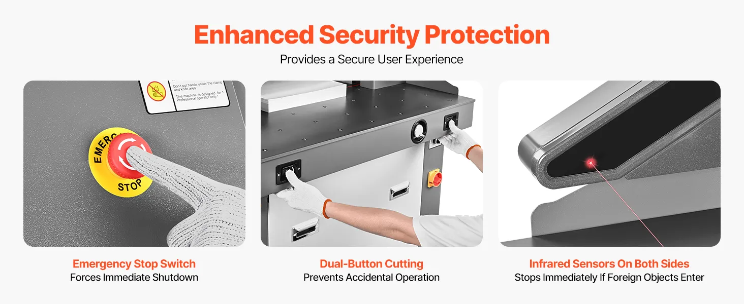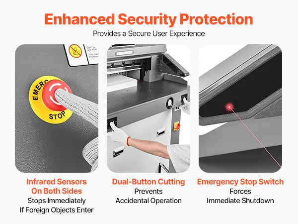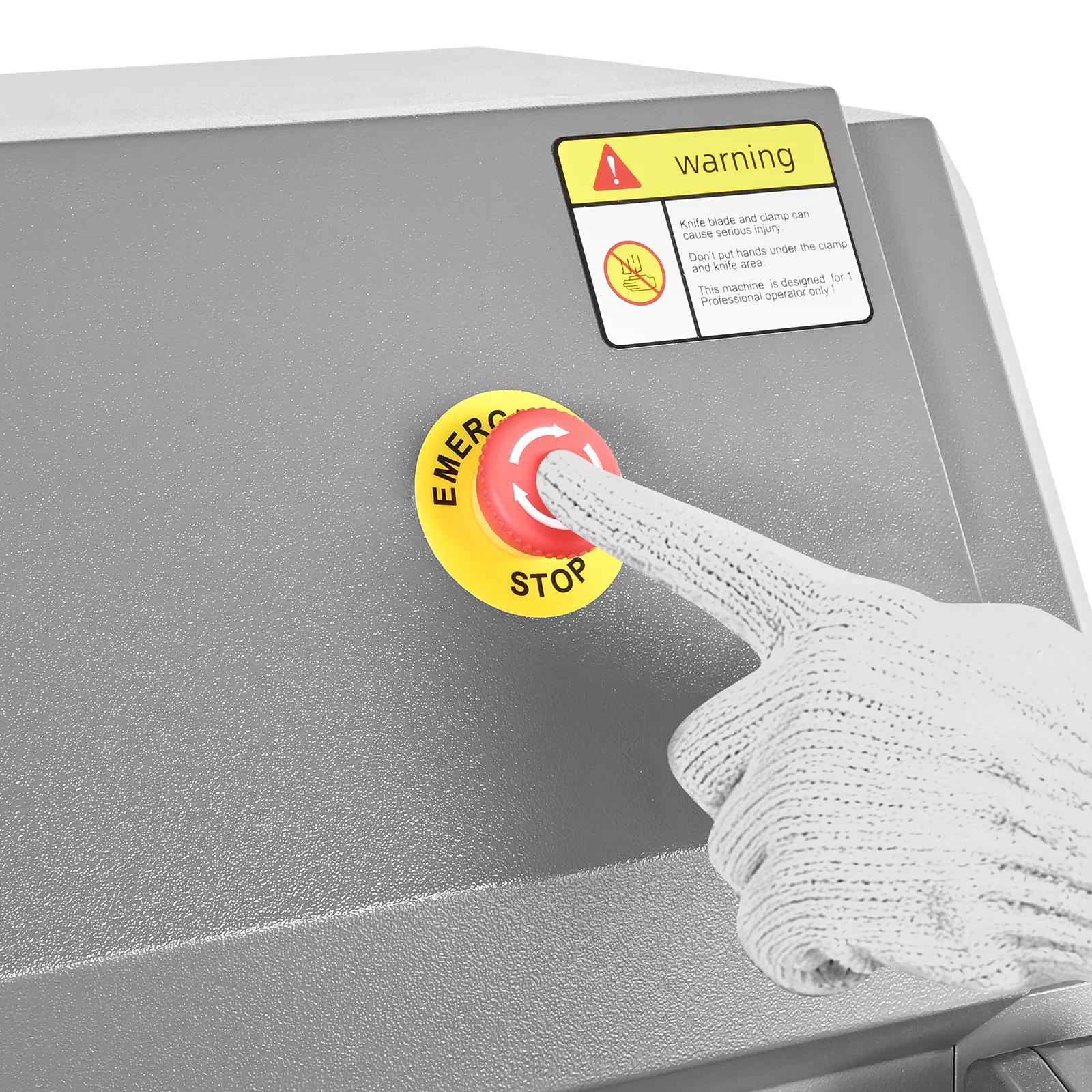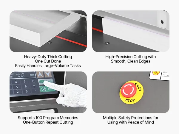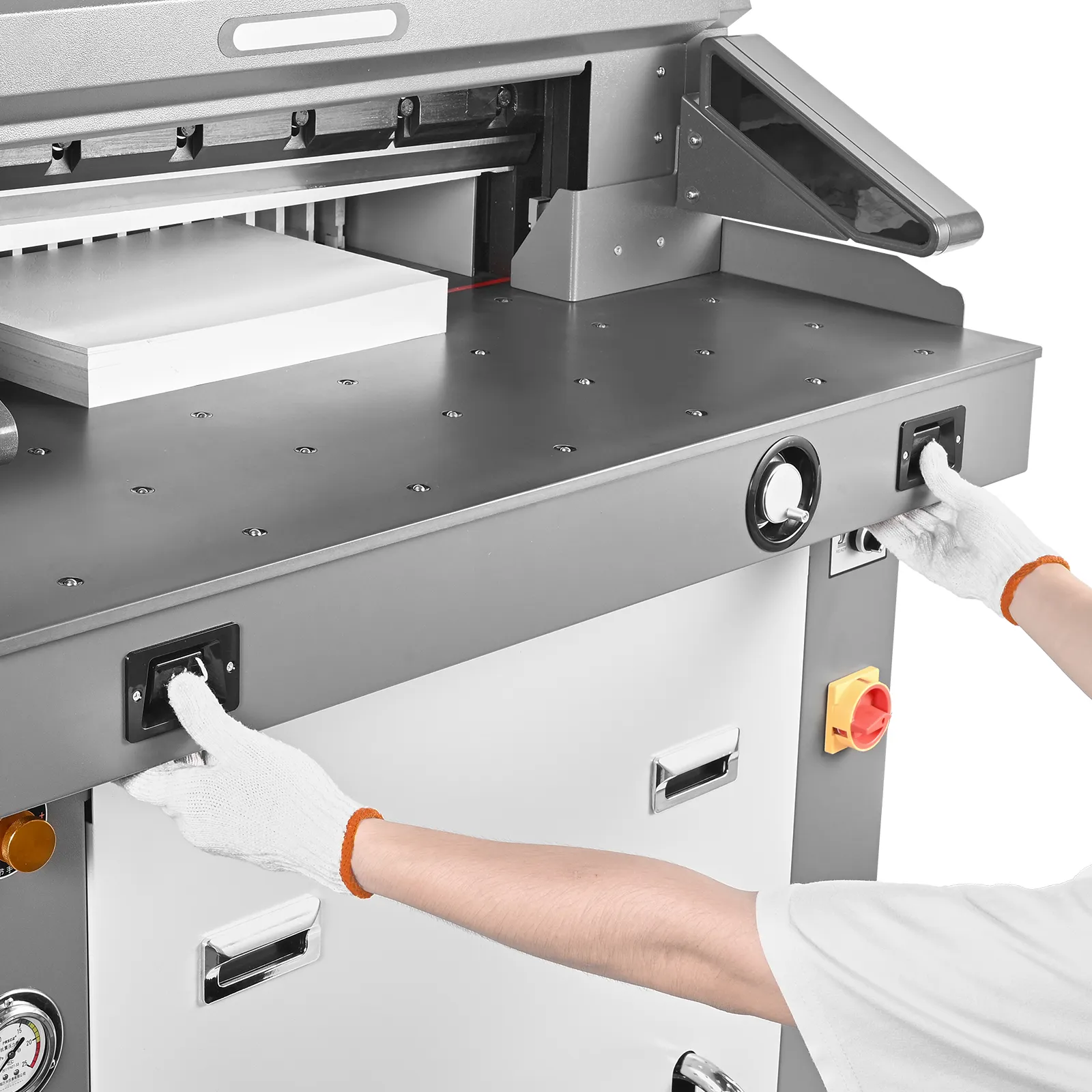 Uitgebreid veiligheidsontwerp: Deze papiersnijder is uitgerust met infraroodsensoren, bediening met twee handen en een noodstopknop. Meerdere veiligheidsvoorzieningen minimaliseren de risico's bij het snijden van zware materialen.