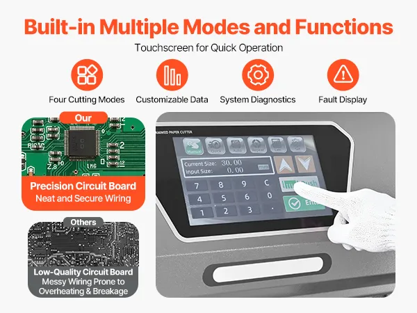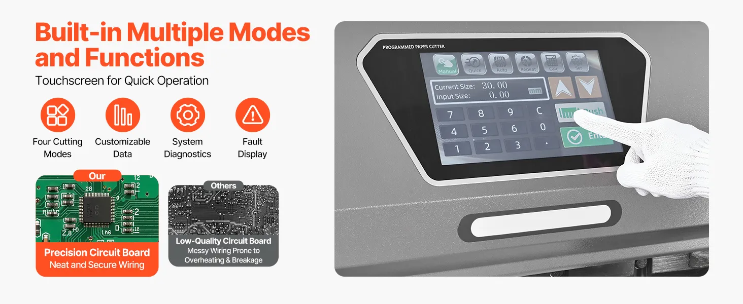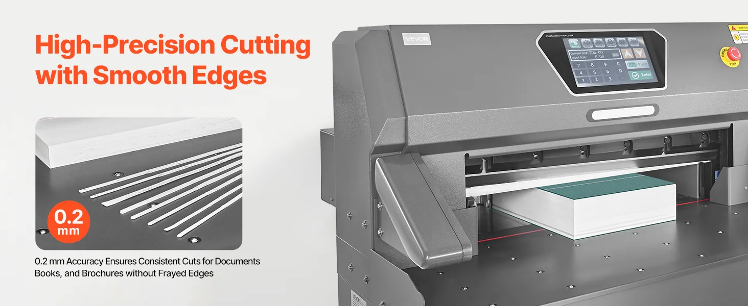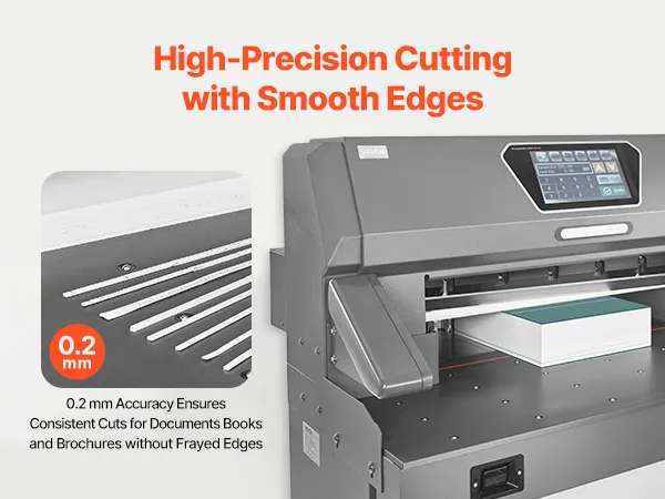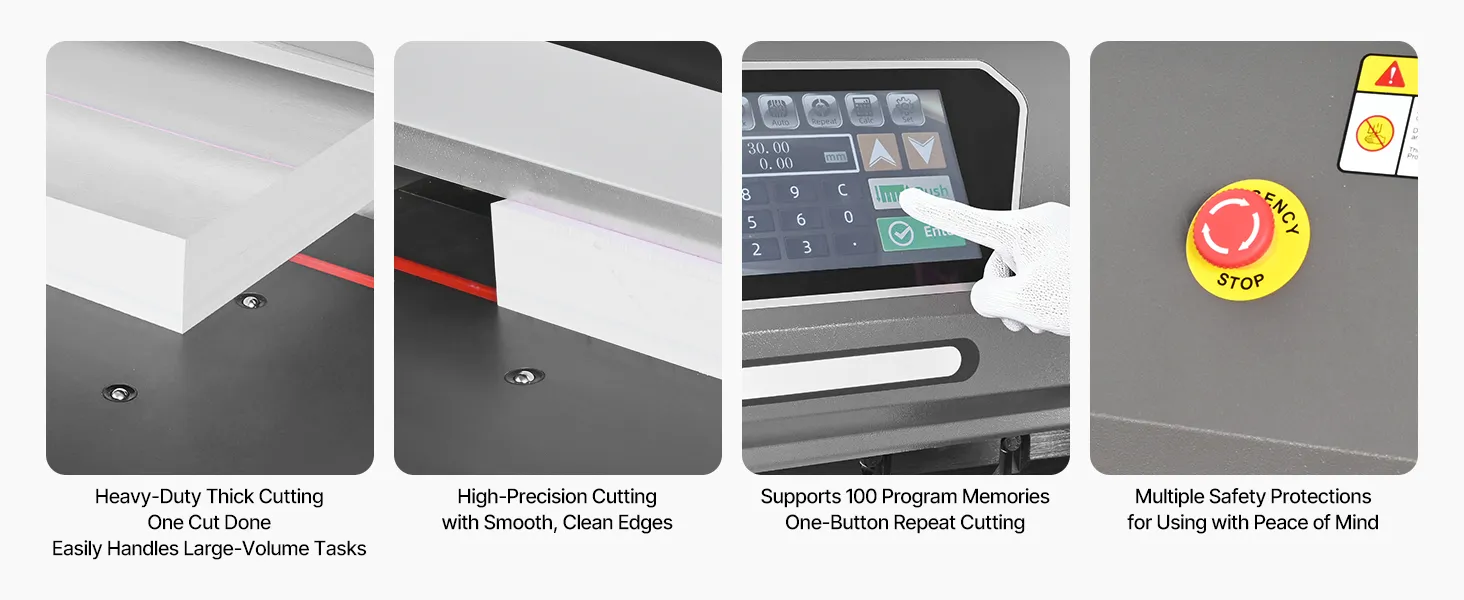 Uitgebreid veiligheidsontwerp: Deze papiersnijder is uitgerust met infraroodsensoren, bediening met twee handen en een noodstopknop. Meerdere veiligheidsvoorzieningen minimaliseren de risico's bij het snijden van zware materialen.