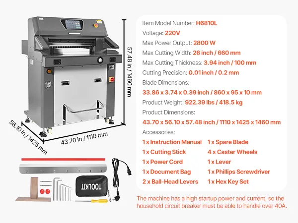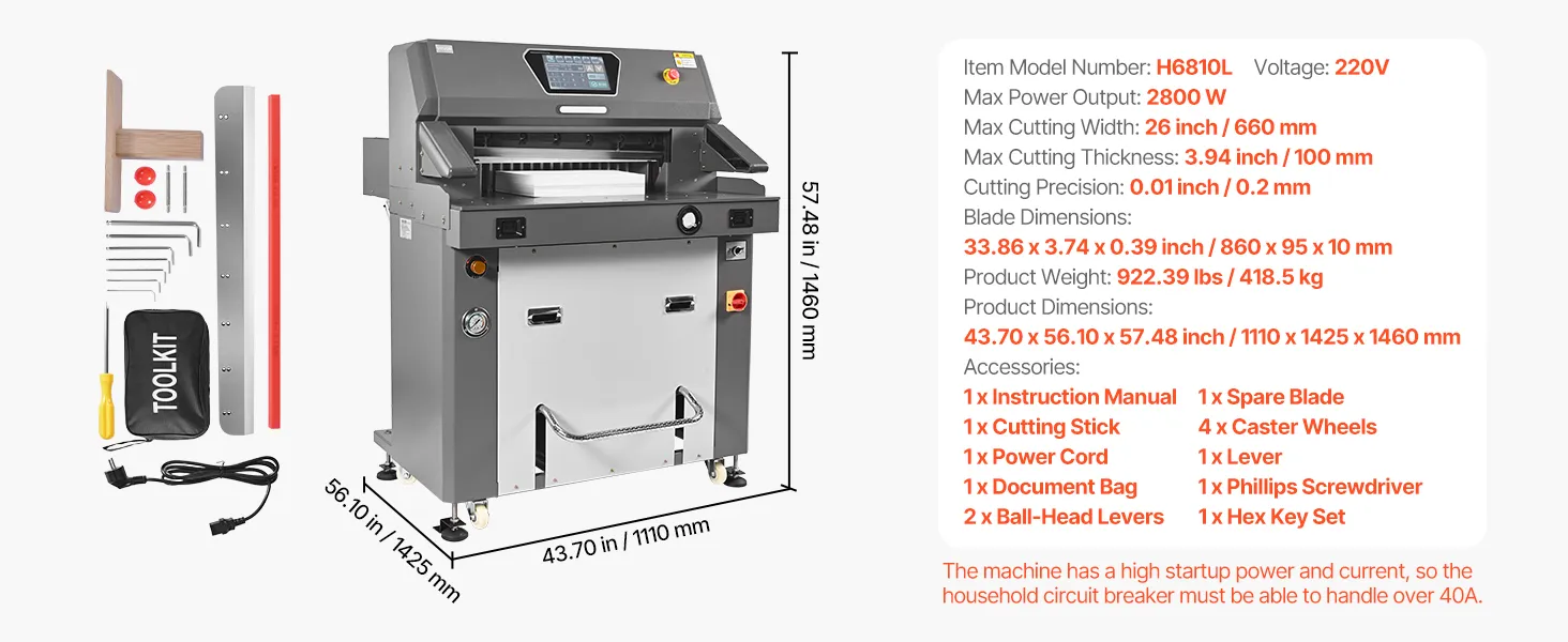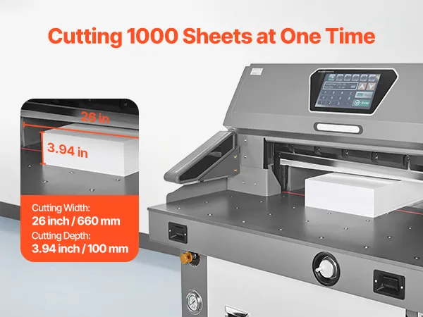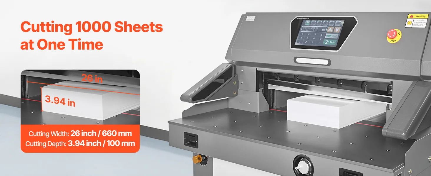 Grote en dikke materialen in één keer snijden: De elektrische papiersnijder snijdt tot 660 mm breed en 100 mm dik in één keer. Hij kan gemakkelijk grote stapels papier, boeken en karton verwerken. (Het apparaat verbruikt aanzienlijk veel stroom bij het opstarten. Zorg ervoor dat de elektrische installatie in uw huis geschikt is voor meer dan 40 ampère.)