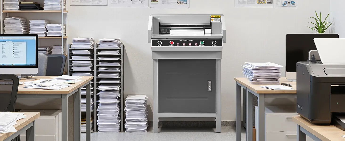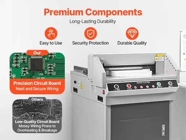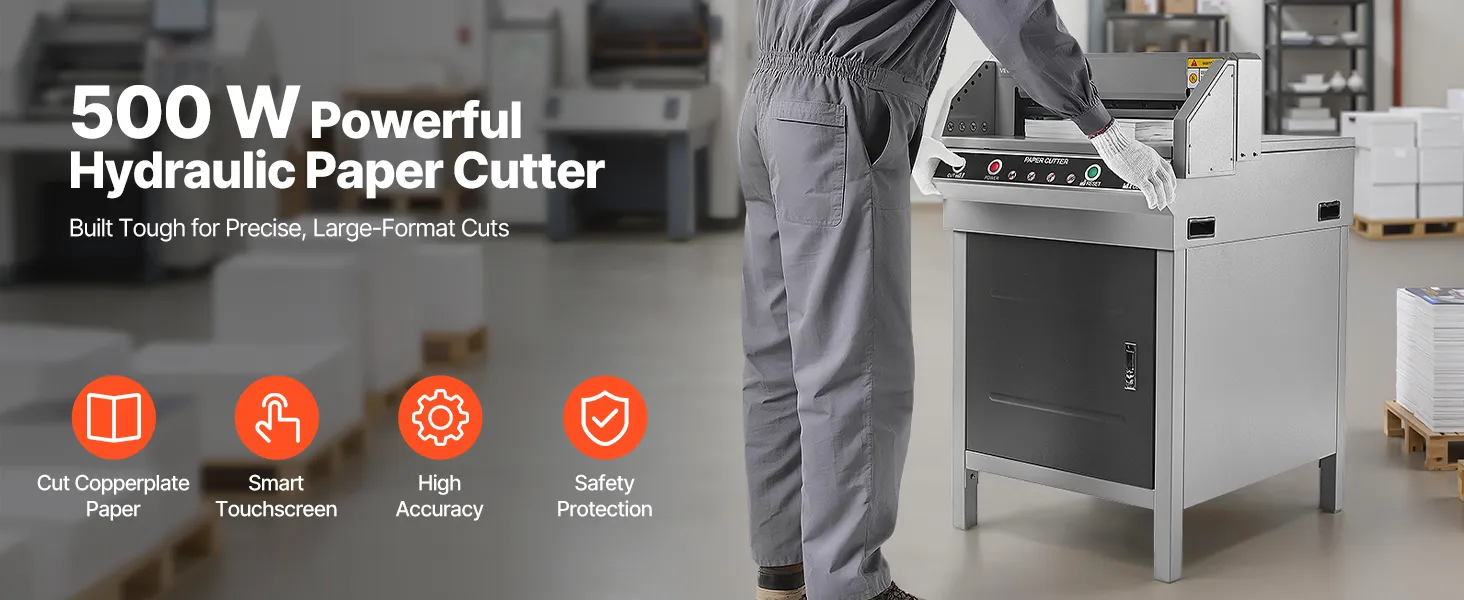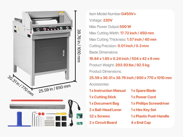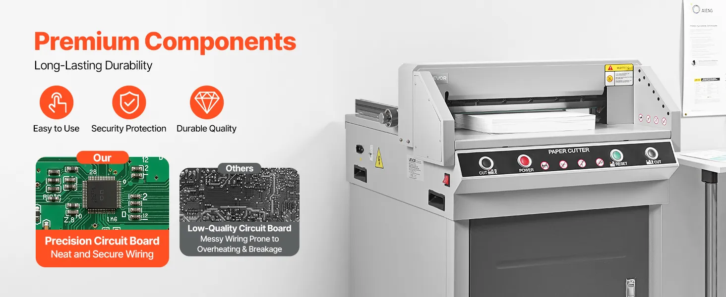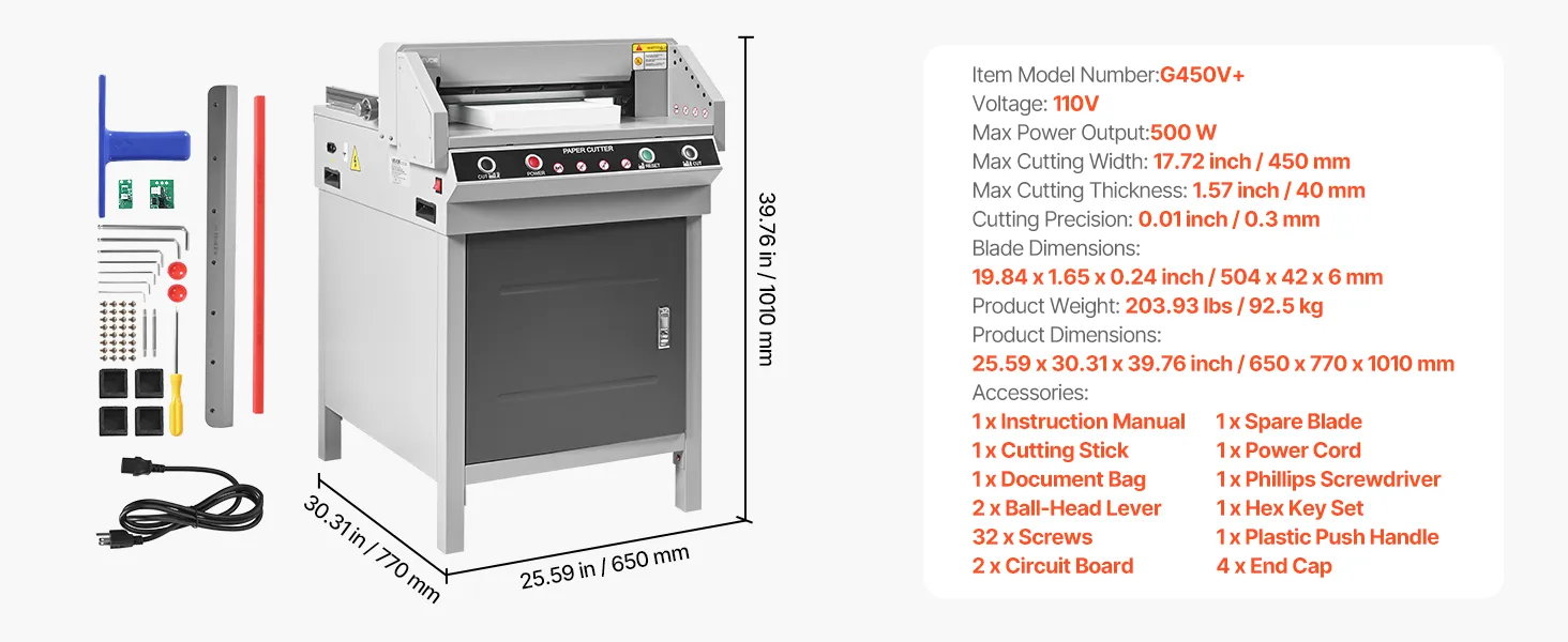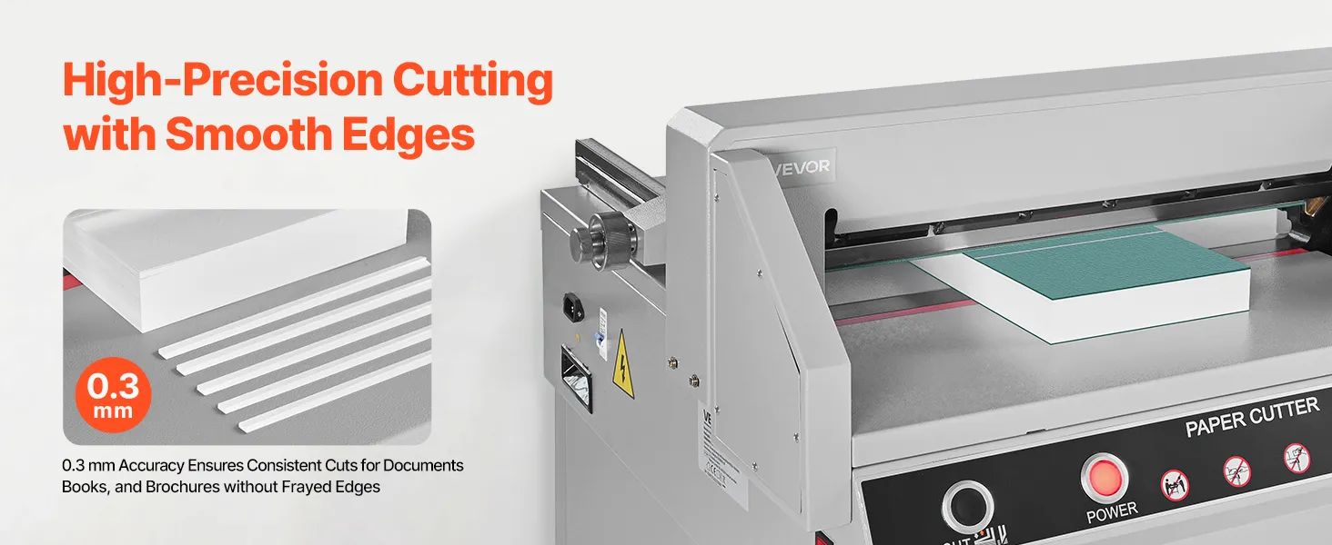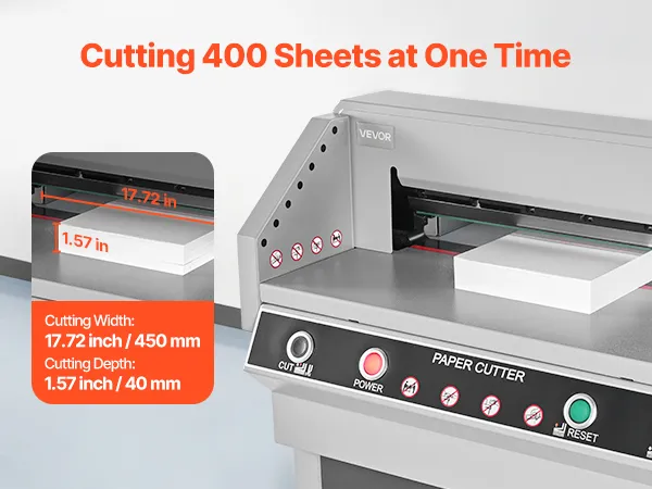 Grote en dikke materialen in één keer snijden: De elektrische papiersnijder snijdt tot 450 mm breed en 40 mm dik in één keer. Hij verwerkt efficiënt grote stapels papier, boeken en karton, waardoor tijd en moeite worden bespaard.