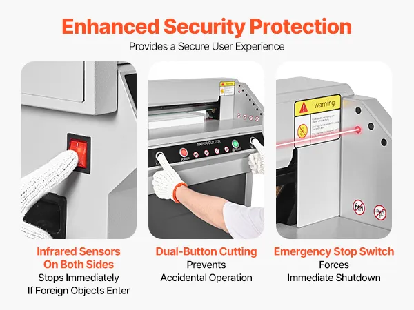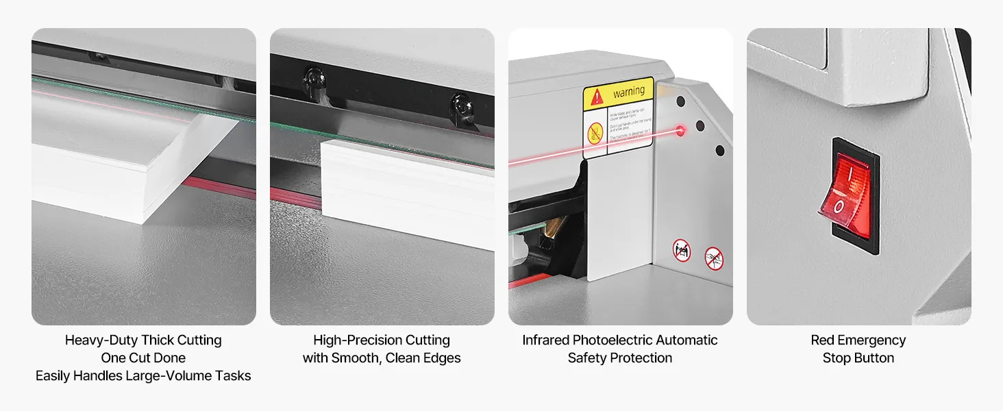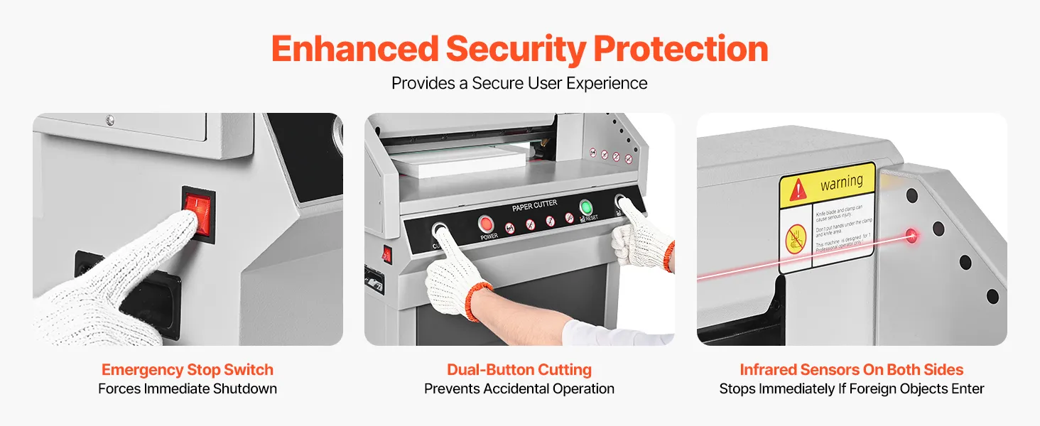 Uitgebreid veiligheidsontwerp: Deze papiersnijder is uitgerust met infraroodsensoren, bediening met twee handen en een noodstopknop. Meerdere veiligheidsvoorzieningen minimaliseren de risico's bij het snijden van zware materialen.