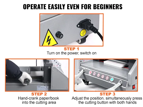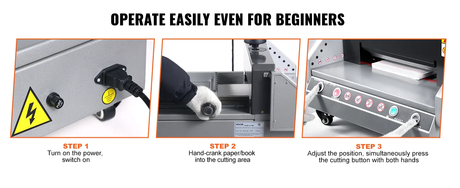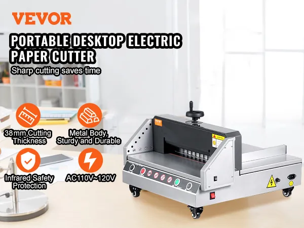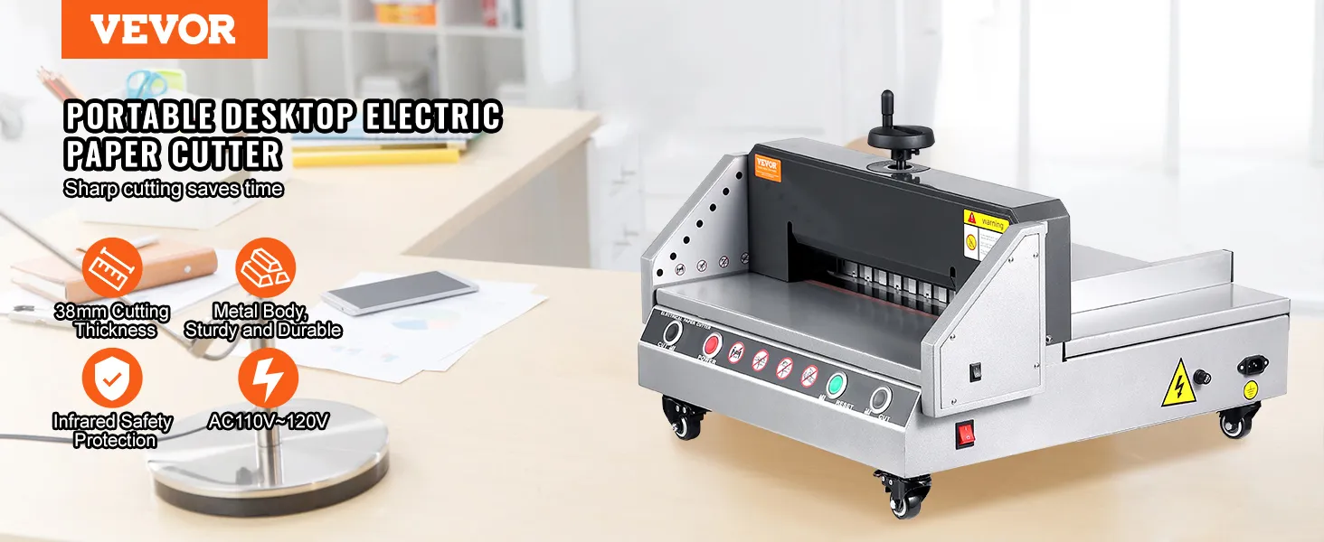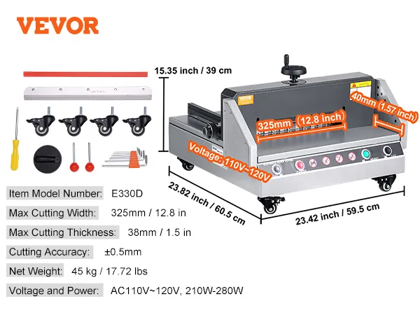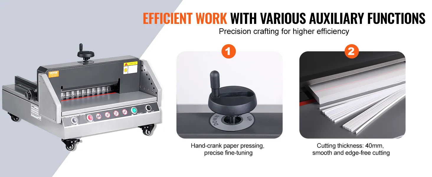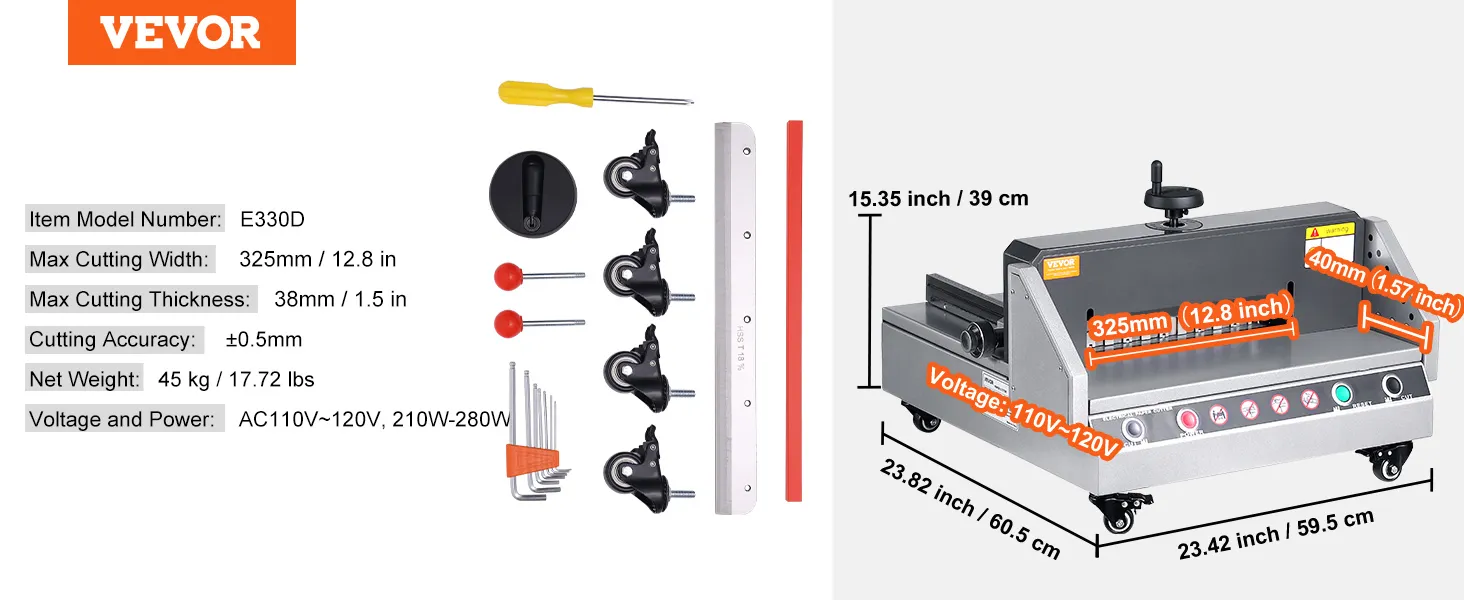 13" Cutting Width & 1.57" Depth: VEVOR electric paper cutter is made of high-quality steel plate, universal wheel design for users to use more efficiently. Spare blades and cutting rods ensure extended blade life. Apart from regular copy paper, it can also cut soft leather, excluding gray board and PVC plastic sheets.