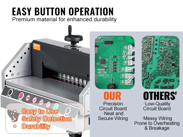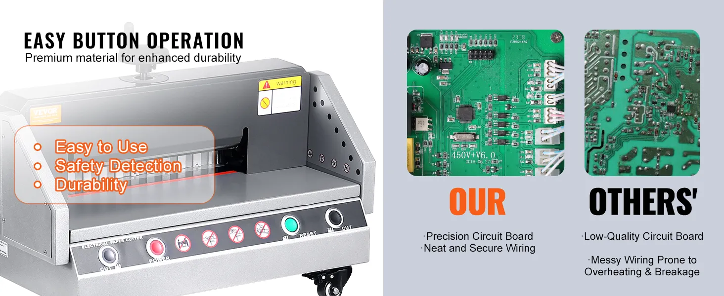Convenient and Durable: The control panel enhances user's convenience. The dual-key paper-cutting operation with high-quality chips, ensures durability. Additionally, the high-speed steel blade ensures sturdiness and durability, providing a more convenient and reliable experience.