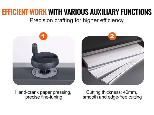Precision Paper Cutting: We have incorporated a range of auxiliary functions, including a hand-cranked paper push design that saves time and increases speed. It assists in precise micro-adjustments. The premium sharp blades can effortlessly cut paper up to 40mm in thickness. Get a smooth, edge-free cutting experience!
