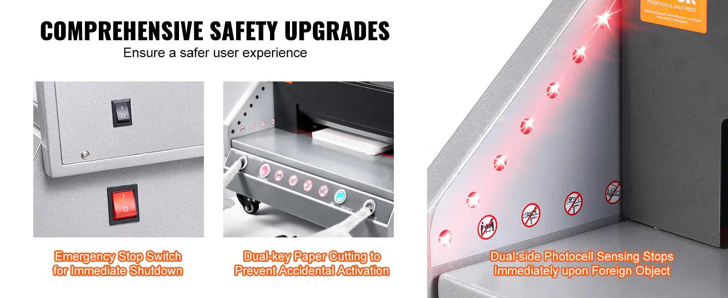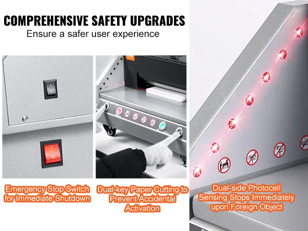 To ensure safety during operation, we've incorporated infrared sensors on each side, halting the electric paper cutter upon detecting foreign objects. Dual-button activation prevents accidental starts.
