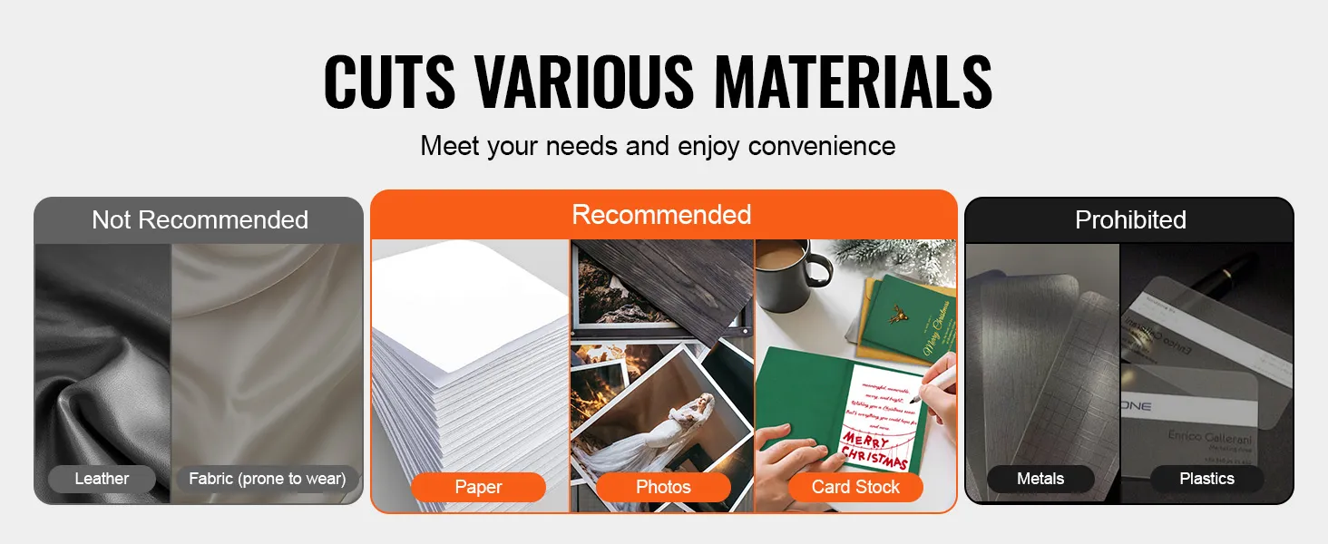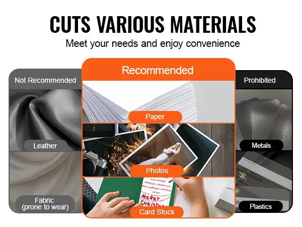 Our industrial paper cutter is perfect for paper, photos, and cards. It is not recommended for leather or fabric (it is prone to wear) and is forbidden for cutting metal or plastic!
